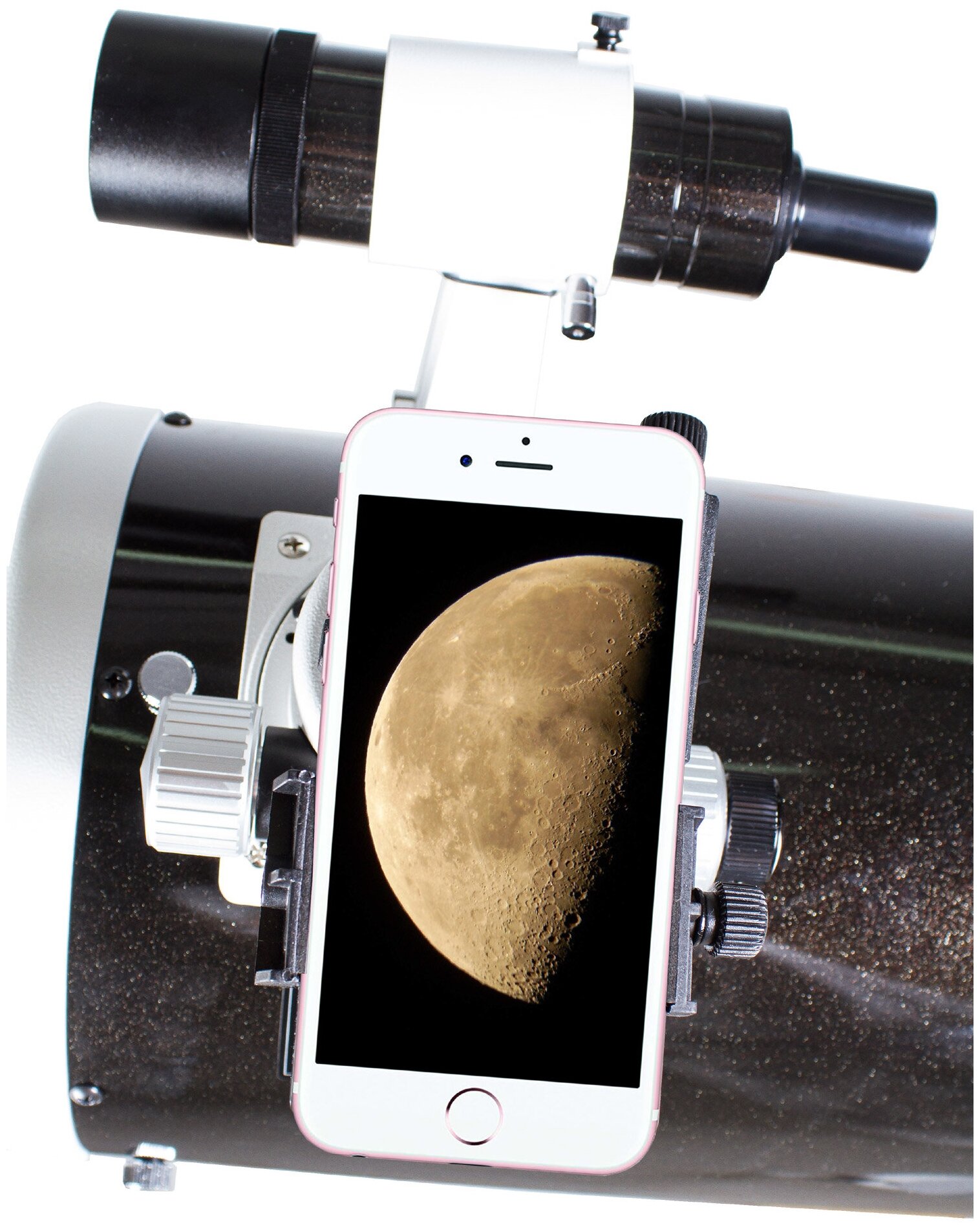 Адаптер Levenhuk A10 надежно фиксируется на окуляре оптического прибора, после чего на него устанавливается смартфон. Адаптер совместим со всеми моделями смартфонов. После того как вы включили камеру, нужно просто отцентрировать ее относительно поля зрения окуляра и сфокусироваться на интересующем вас объекте.
