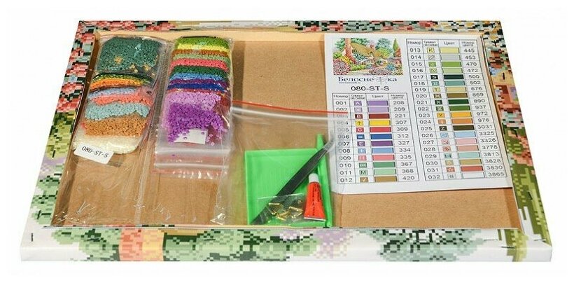 | Комплектация | Основа мозаичной картины (холст на подрамнике с листом оргалита) Комплект искусственных камней Пинцет Пластмассовый лоток для камней Пластмассовый карандаш для камней Жидкий клей |