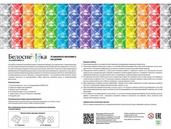 | Комплектация | Холст на подрамнике с клеевой основой, Условные обозначения, Акриловые камни-стразы, Жидкий клей, пинцет, Блюдце, Инструкция, Крепеж для подвешивания. |