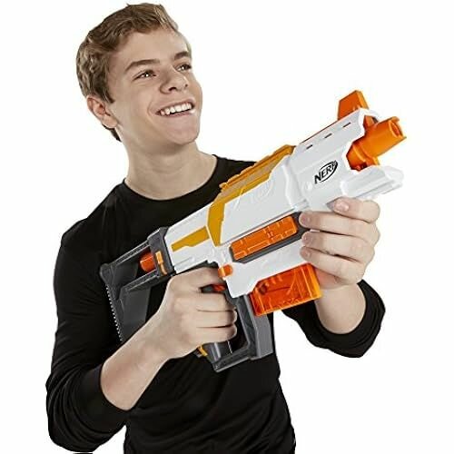 Бластер NERF Модулус Рекон - яркий представитель знаменитой серии игрушечного оружия. Привлекательный дизайн контрастных цветов позволит найти патроны и комплектующие на поле боя. Эргономичная форма удобна для захвата, а специальное устройство обоймы вмещает в себя несколько снарядов одновременно, позволяя владельцу сделать несколько выстрелов без перезарядки. Материал, из которого изготовлены патроны, абсолютно безопасен, что обезопасит юного бойца от нежелательных микротравм.