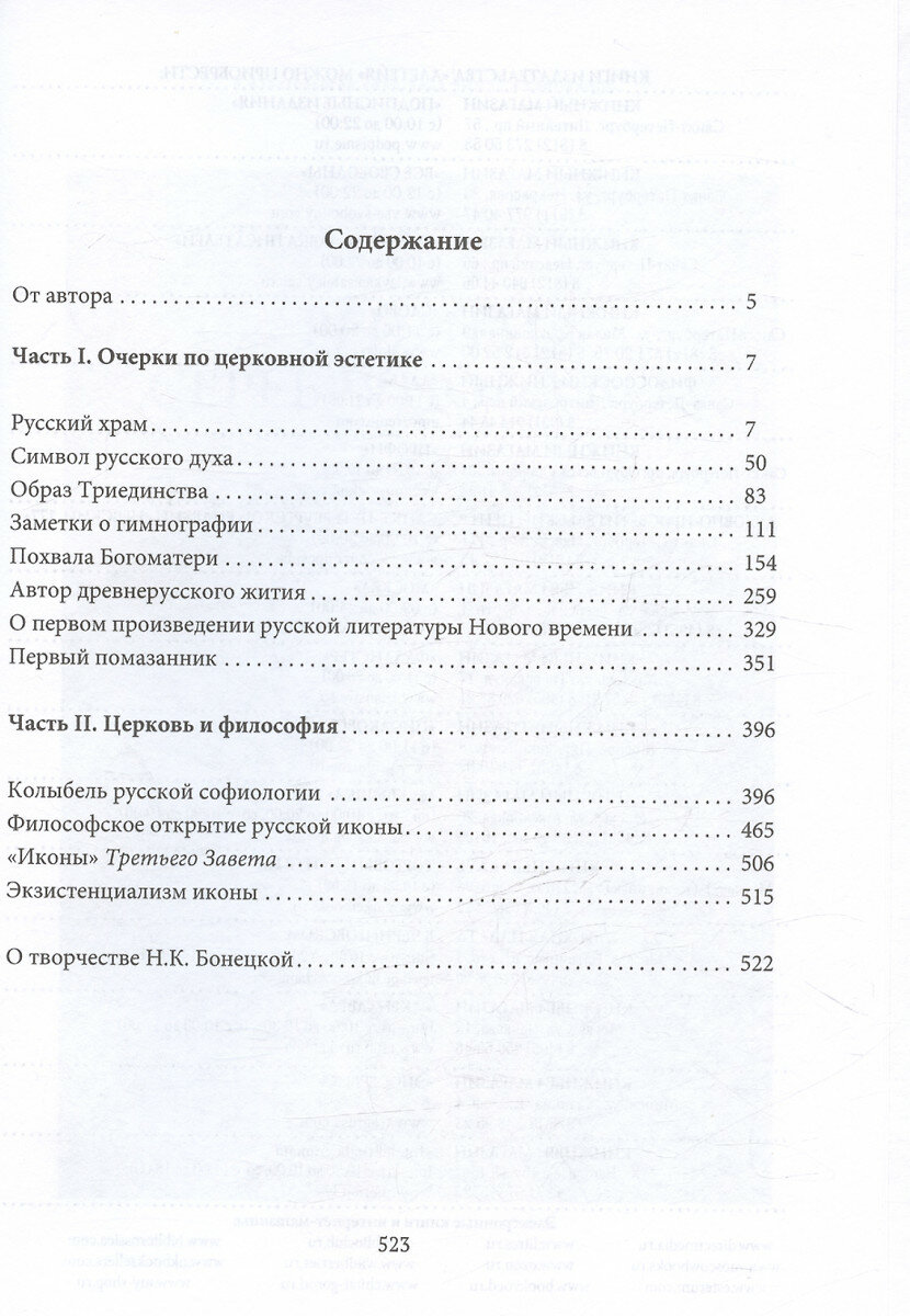 В книге представлены философские эссе, предмет которых — искусство русской православной Церкви. Наталья Бонецкая, историк русской философии, выдвигает самобытные концепции храмовой архитектуры, иконописи, гимнографии, агиографии. Ее работы создавались в период времени с конца 1970-х и вплоть до первой половины 2020-х годов. В них можно увидеть