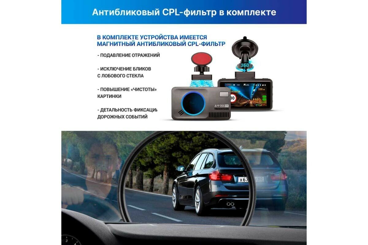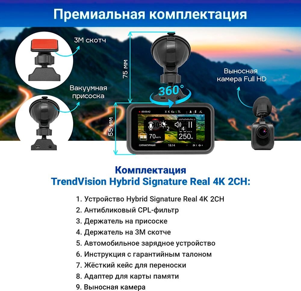 TrendVision -инновационное комбо-устройство 3 в 1, включающее в себя видеорегистратор с реальным разрешением съёмки 4K (Ultra HD), сигнатурный радар-детектор с 4 режимами и GPS-информатор. C помощью LNA-усилителя сигналов нового радарного модуля, а также сигнатурного определения излучения устройство отсекает паразитные частоты, определяет только те, что исходят от камер и радаров на дальностях до +130%.Также аппарат обладает возможностью управления, настройки, просмотра видео, обновления ПО и баз камер через мобильное приложение, благодаря встроенному Wi-Fi. Сенсор жестов позволяет одним взмахом руки отключить звук на аппарате или сделать фото.