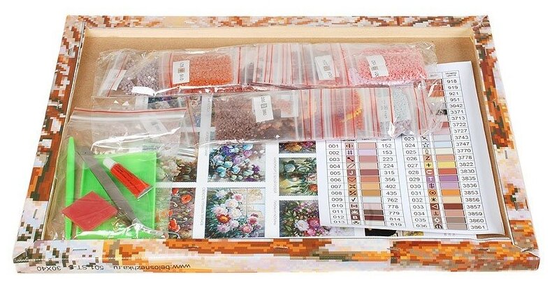 | Комплектация | Холст на подрамнике с клеевой основой, Условные обозначения, Акриловые камни-стразы, Жидкий клей, пинцет, Блюдце, Инструкция, Крепеж для подвешивания. |