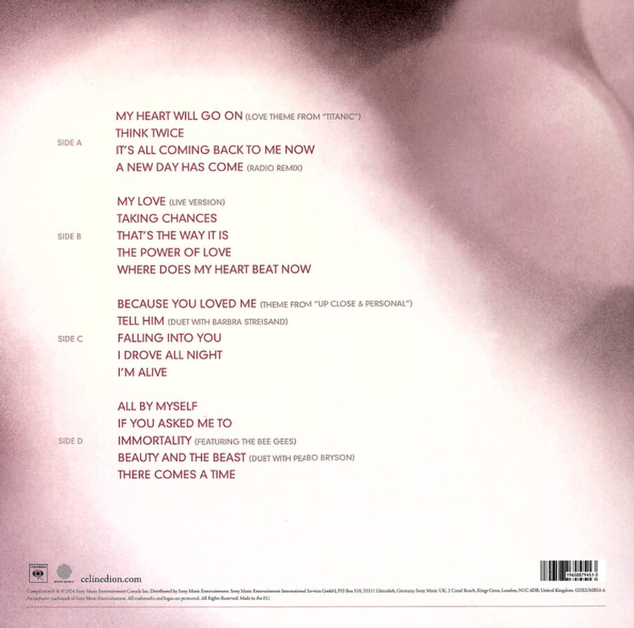 "My Love Essential Collection" – переиздание третьего сборника певицы Селин Дион, первоначально выпущенного в 2008 году. Он включает лучшие хиты артистки, записанные между 1990 и 2008 годами, в том числе: "My Heart Will Go On", "Because You Loved Me", "The Power of Love" и "It's All Coming Back to Me Now". После выхода релиз возглавил чарты в Нидерландах, Бельгии и Ирландии, а также чарт сборников во Франции. В Великобритании и США он дебютировал на пятом и восьмом местах соответственно, получив там платиновый статус. Трек-лист: LP 1 A1. My Heart Will Go On (Love Theme From "Titanic") A2. Think Twice A3. It's All Coming Back To Me Now A4. A New Day Has Come (Radio Remix) B1. My Love (Live Version) B2. Taking Chances B3. That's The Way It Is B4. The Power Of Love B5. Where Does My Heart Beat Now LP 2 C1. Because You Loved Me (Theme From "Up Close & Personal") C2. Tell Him C3. Falling Into You C4. I Drove All Night C5. I'm Alive D1. All By Myself D2. If You Asked Me To D3. Immortality D4. Beauty And The Beast D5. There Comes A Time Селин Дион — канадская певица. Называемая "Королевой мощных баллад", она известна своим мощным и техничным вокалом. Ее музыка включает в себя такие жанры, как поп, рок, R&B;, госпел и классическую музыку. Ее записи в основном на английском и французском языках, хотя она также пела на испанском, итальянском, немецком, латыни, японском и китайском языках. С рекордными продажами более 200 миллионов по всему миру, она входит в число самых продаваемых музыкальных исполнителей всех времен. Она выиграла пять премий "Грэмми", получила две степени почетного доктора музыки в Музыкальном колледже Беркли и Университете Лаваля.