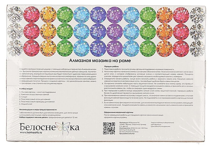 | Комплектация | Холст на подрамнике с клеевой основой, Условные обозначения, Акриловые камни-стразы, Жидкий клей,Пинцет, СтилусКлеевая подушечка Блюдце, Инструкция, Крепеж для подвешивания. |