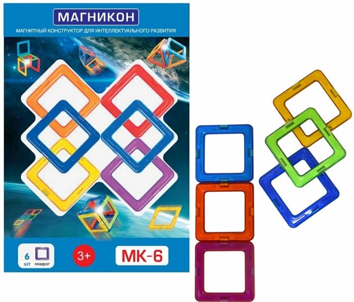 Конструктор магнитный Магникон. Квадрат (МК-6) - дополнительные элементы, которые пригодятся владельцам одноименных комплектов. «Магникон» - современный конструктор, который предоставляет широкие возможности для 3D конструирования благодаря новому методу крепления деталей, которые могут соединяться между собой посредством внутренних магнитов. Это свойство позволит будущему владельцу максимально реализовать свой потенциал, собирая объемные постройки и модельки. В процессе конструирования ребенок познакомится не только с основными геометрическими фигурами, но и разовьет свою мелкую моторику рук и пространственное мышление.