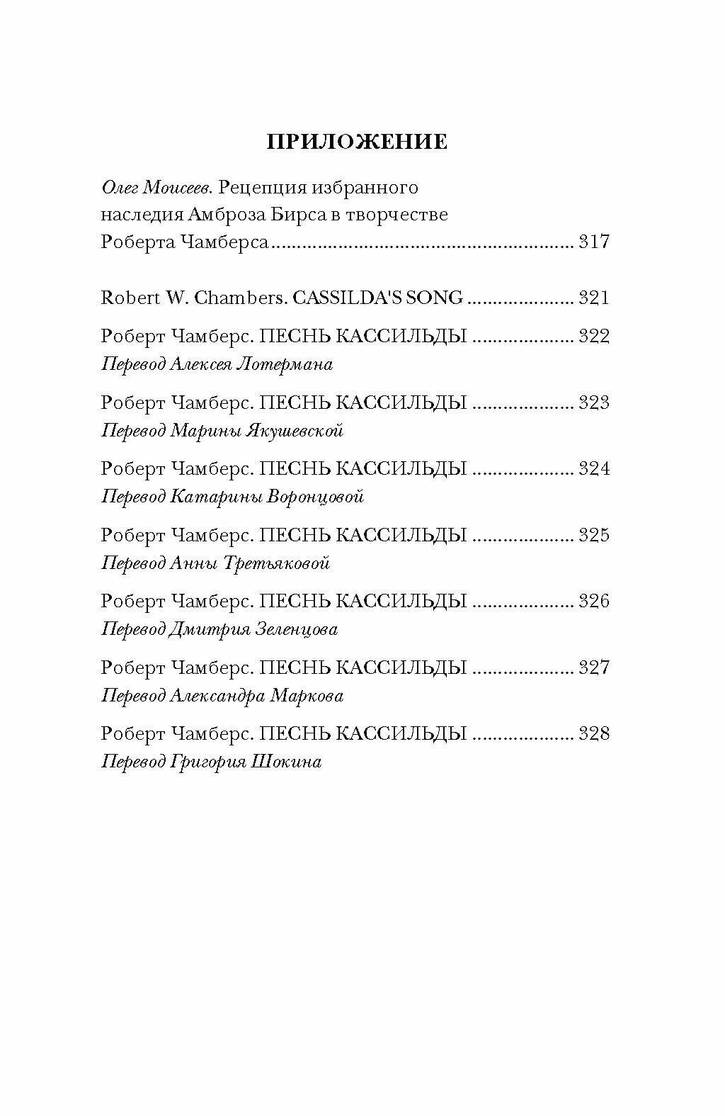 В приложении представлены переводы стихотворения "Песнь Кассильды" Роберта Чамберса, писателя-мистика, создавшего полноценную "мифологию" Каркозы, которая стала основой его великого сборника "Король в Желтом".