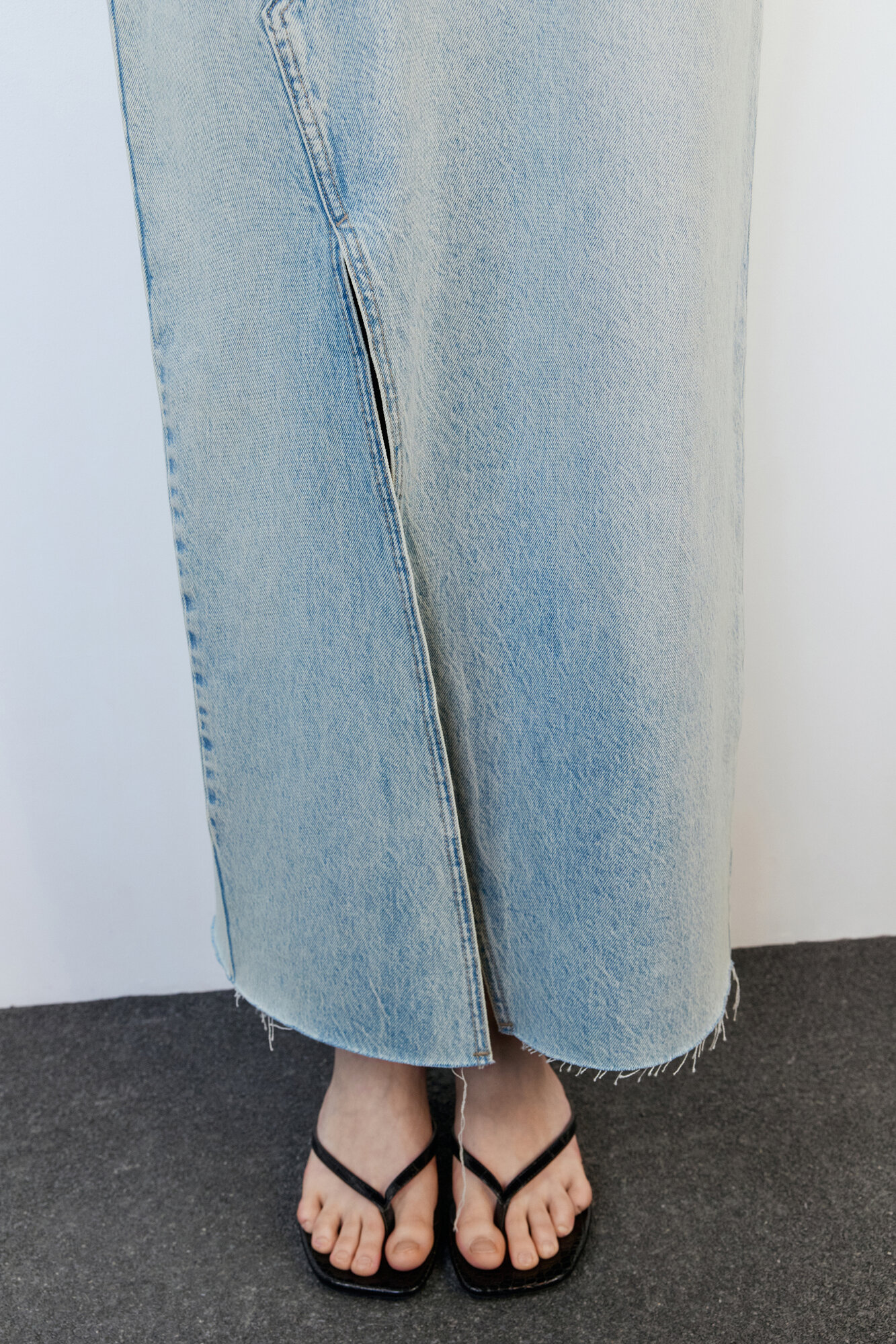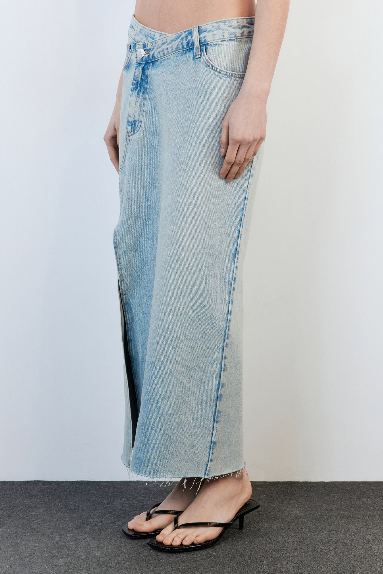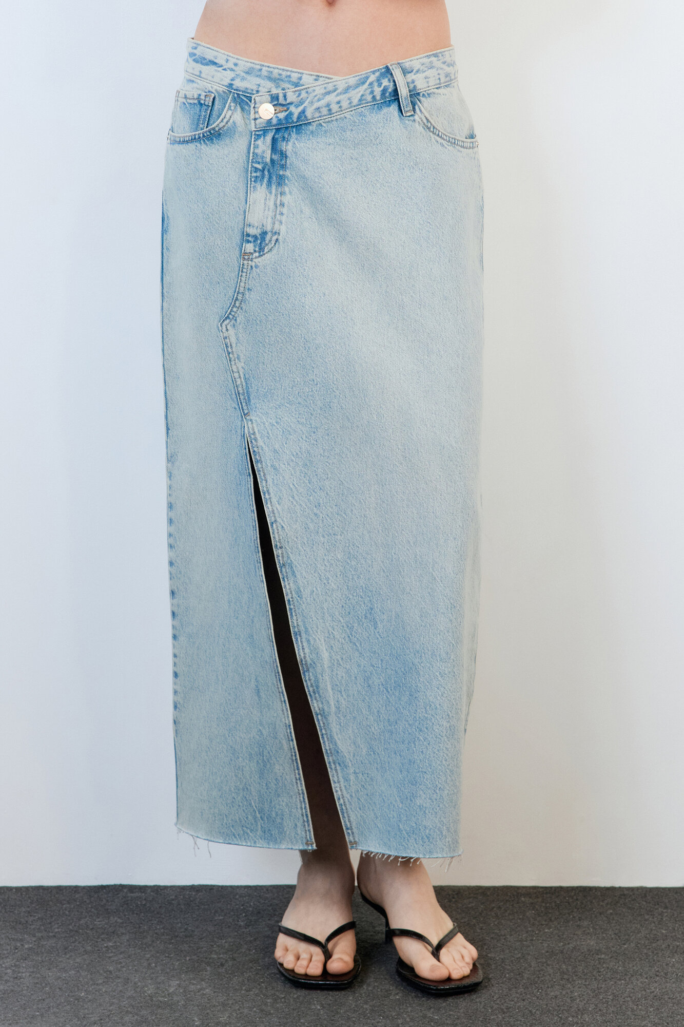 - Что может быть более базовым, чем голубая джинсовая юбка? Только белая футболка, которая будет отлично сочетаться с миди-юбкой из новой летней коллекции. Носи ее с топами, майками, джемперами, рубашками. С ней сочетаются любые цвета и принты, поэтому не сдерживай свою фантазию. Косой разрез добавит классическим образам дерзости, а асимметричный пояс станет акцентом лука. К джинсовой юбке из денима подойдет также любая обувь на любой сезон