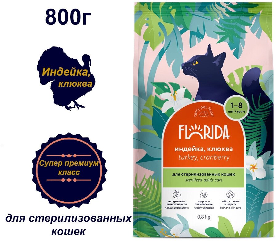 Florida сухой корм для взрослых стерилизованных кошек (Индейка и клюква 800 г.)