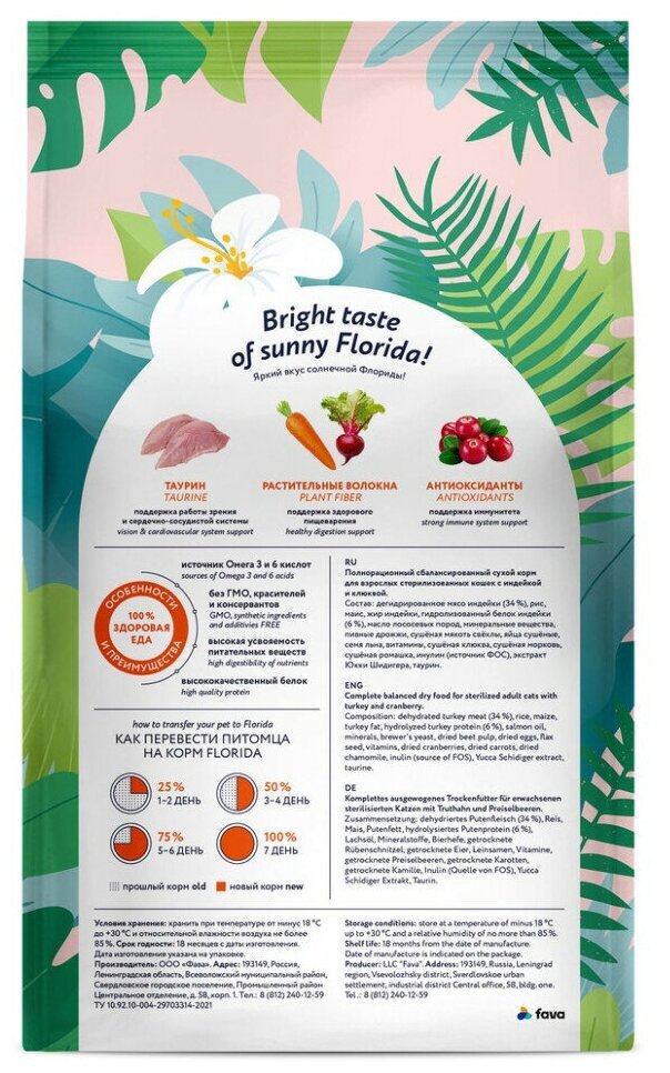 Florida Turkey & Cranberries - сухой корм супер-премиум класса с индейкой и клюквой для стерилизованных кошек и котов в возрасте от 1 до 8 лет. Сбалансированное полнорационное питание заботится о коже и шерсти и способствует здоровому пищеварению. В рационе кормов Florida используется только белок животного происхождения. Преимущества корма: Натуральные антиоксиданты ягоды, фрукты Поддержка работы сердечно-сосудистой системы, зрения таурин Здоровое пищеварение свекла, морковь, дрожжи Натуральные источники Омега 3 и 6 кислот, забота о шерсти и коже семена льна, жир индейки, масло лососевых пород Не содержит ГМО, искусственных красителей и консервантов Размер гранул: 8 - 9 мм.