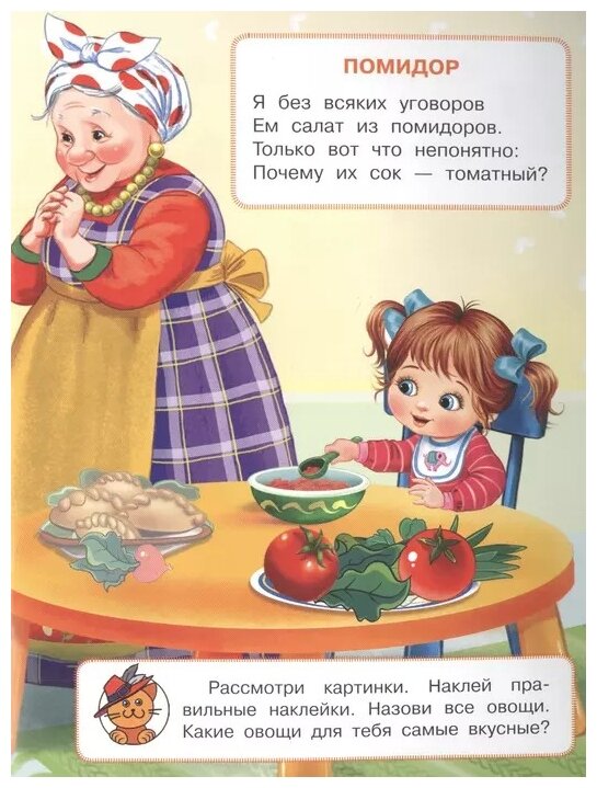 В серии Играем и учимся представлена линейка развивающих книг для подготовки детей к школе. - Знакомство детей с овощами, фруктами и ягодами. - Стихи для запоминания названий овощей, фруктов и ягод. - Развитие внимания, памяти и логического мышления. - Наклейки разного размера. - Задания от Кота в сапогах.
