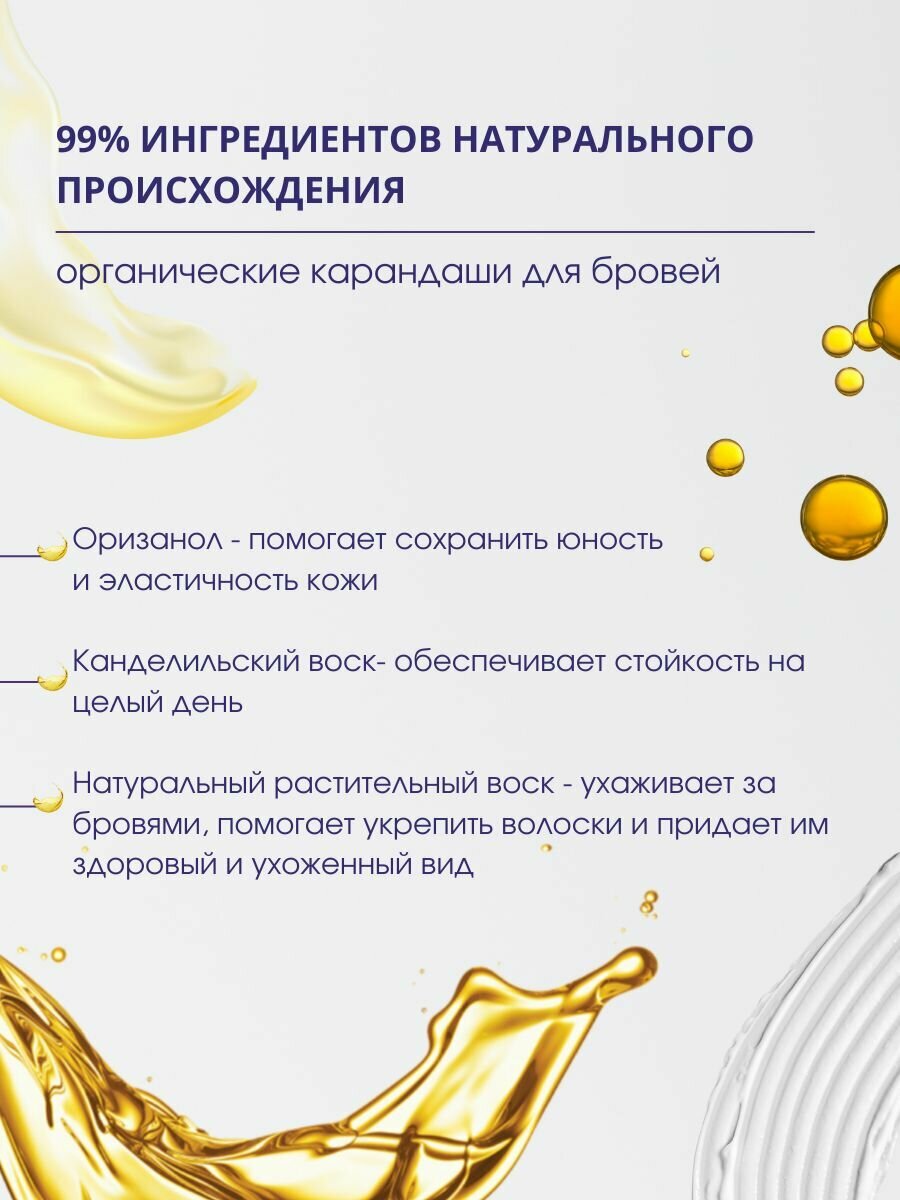Инновационный карандаш, разработанный специально для создания идеальных бровей. Он обладает уникальной формулой, в основе которой лежит канделильский воск, натуральный растительный воск, который обеспечивает стойкость на целый день. Оризанол, входящий в состав, ухаживает за бровями, помогает укрепить волоски и придает им здоровый и ухоженный вид. Кроме того, улучшает питание и рост волос, способствуя повышению их упругости и эластичности. Благодаря комбинации этих активных ингредиентов, карандаш для бровей позволяет создать четкую форму, создавая естественный и безупречный вид.