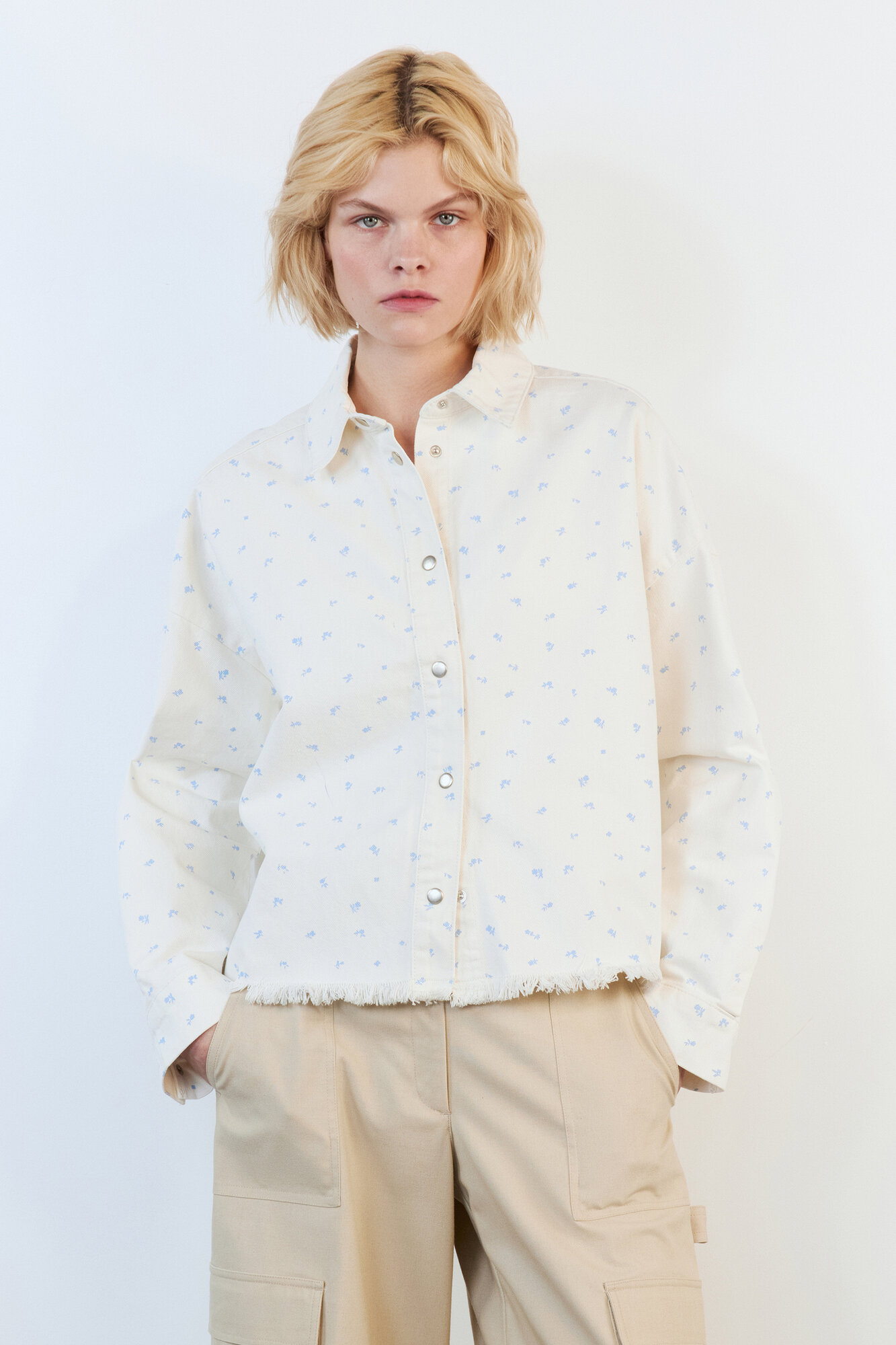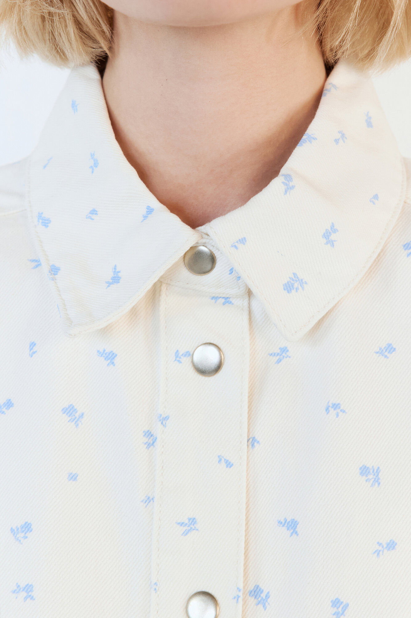 - Светлая бежевая летняя джинсовая рубашка с нежным голубым цветочным принтом
