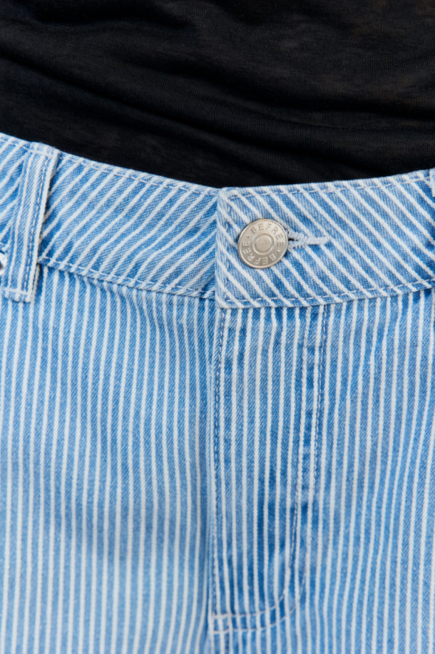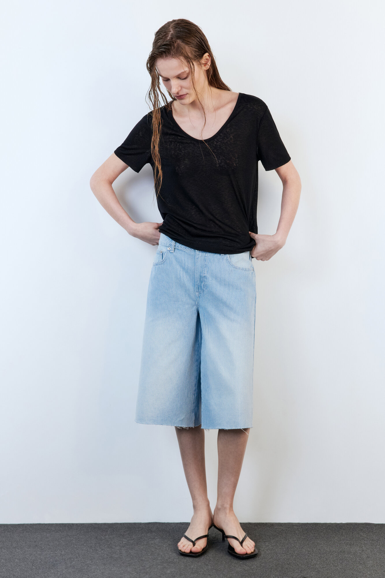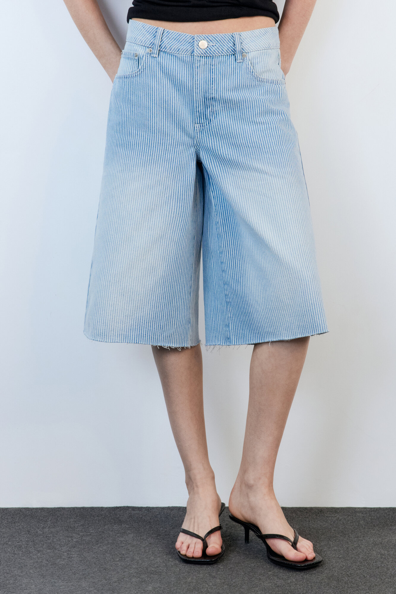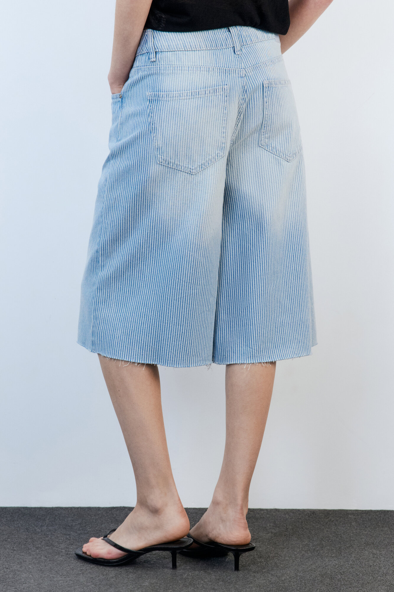 - Шорты-бермуды джинсовые в полоску. Широкие женские джинсовые бриджи из легкого и очень приятного к телу 100% хлопкового денима