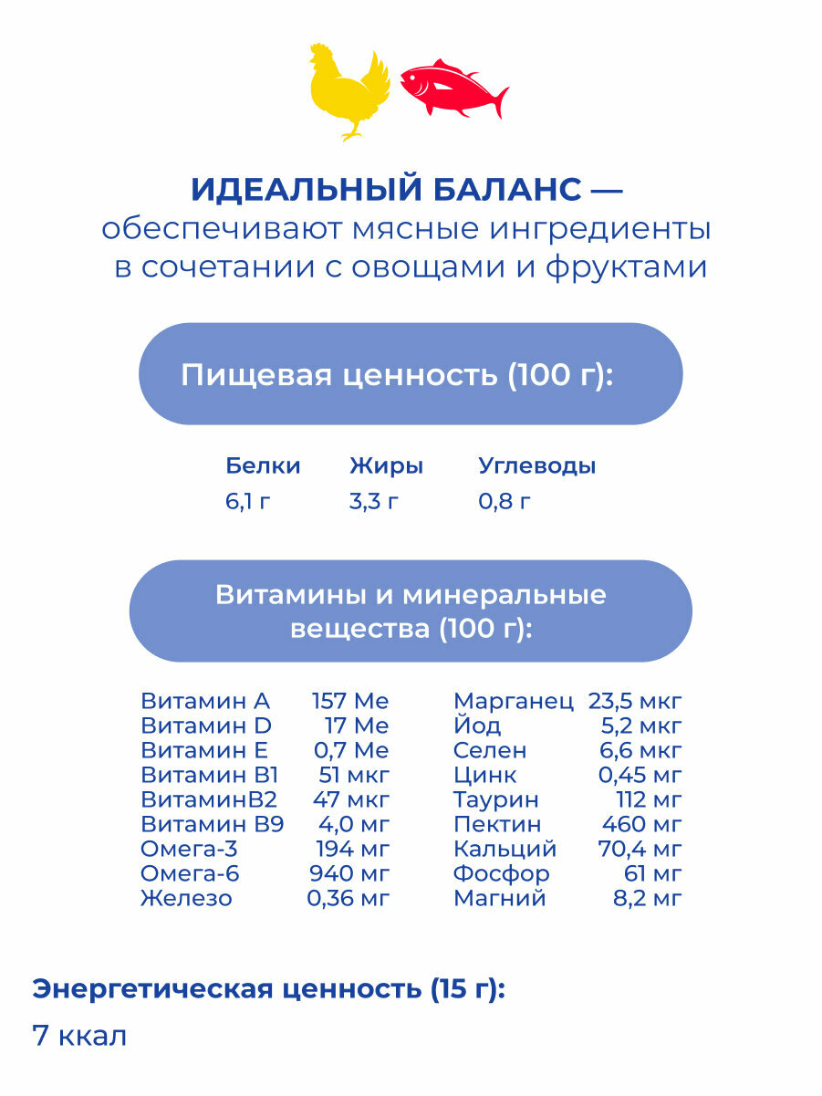 Крем-лакомства для кошек Jarvi, сочетающие в себе нежную текстуру, вкус и пользу, идеально подходят для ежедневного поощрения. Финское качество и холистический подход гарантируют не только хорошее настроение, но и общее здоровье вашего питомца. В составе 97% свежих мясных и рыбных ингредиентов, которые обеспечивают идеальный баланс белка в организме, овощи и фрукты, улучшающие пищеварение, а также все необходимые витамины и минералы, укрепляющие иммунную систему, поддерживающие здоровье кожи и шерсти и содействующие правильному развитию костей и суставов питомца.