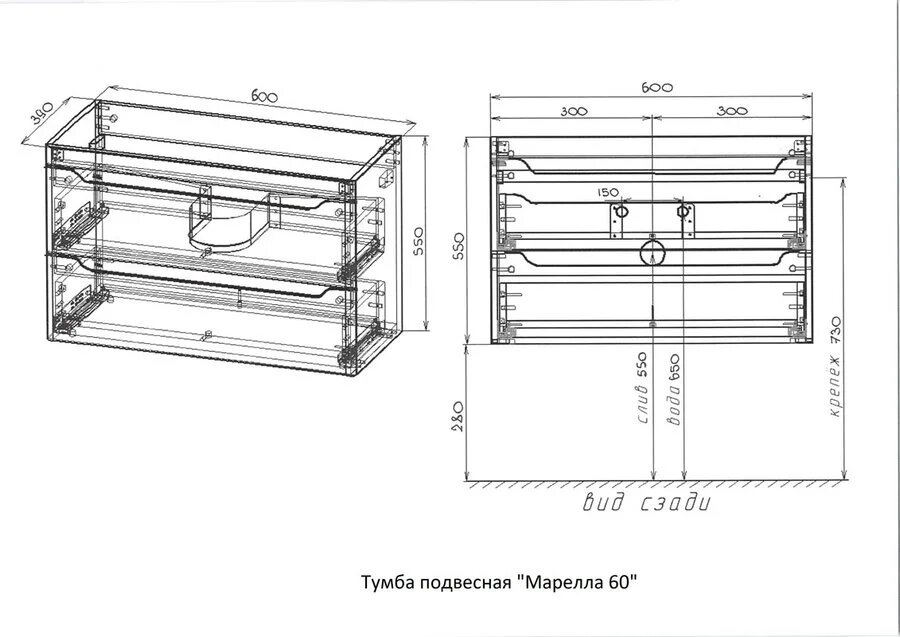 - Размеры корпуса тумбы (ШхВхГ): 600х550х390 мм.