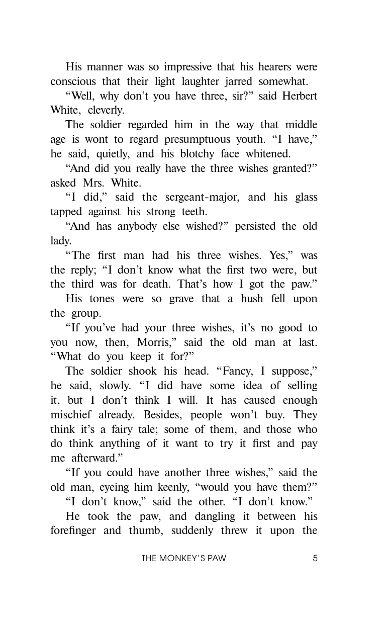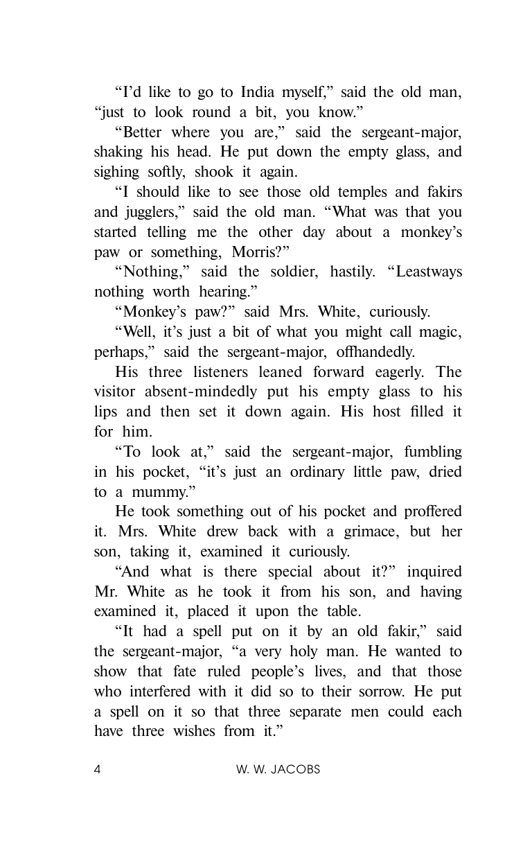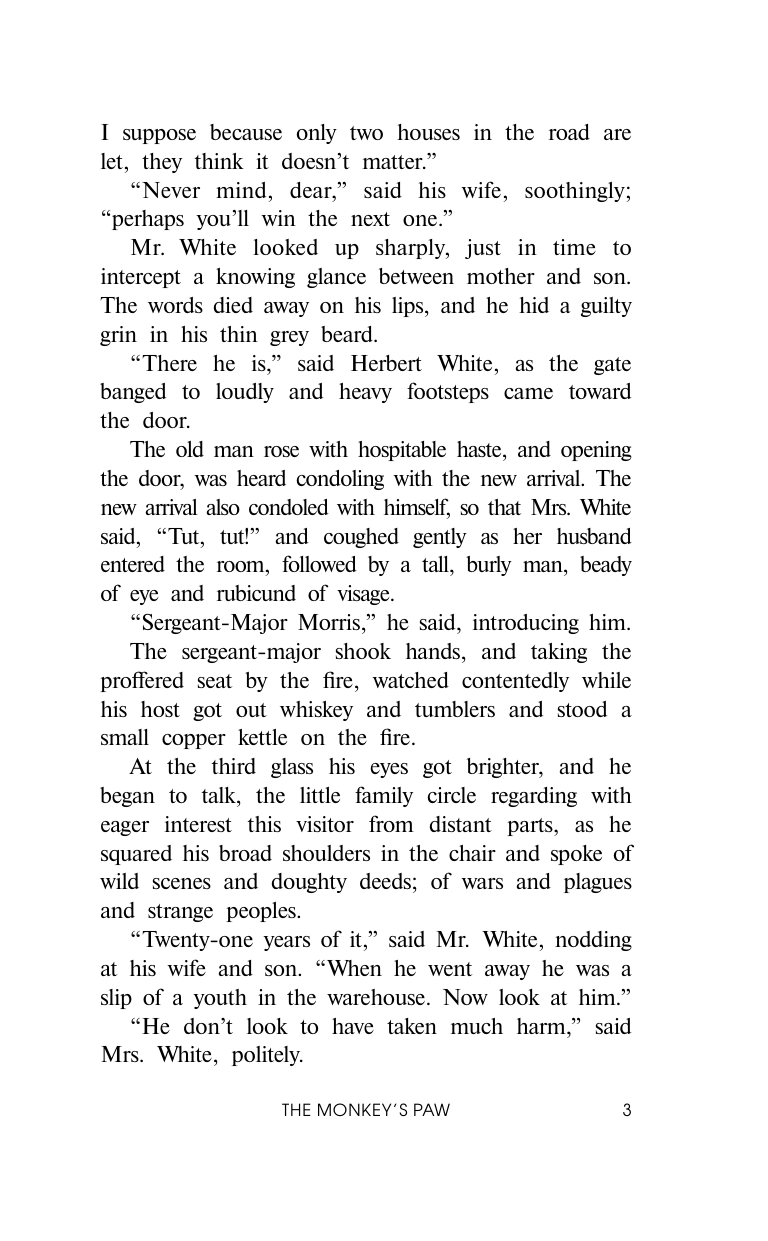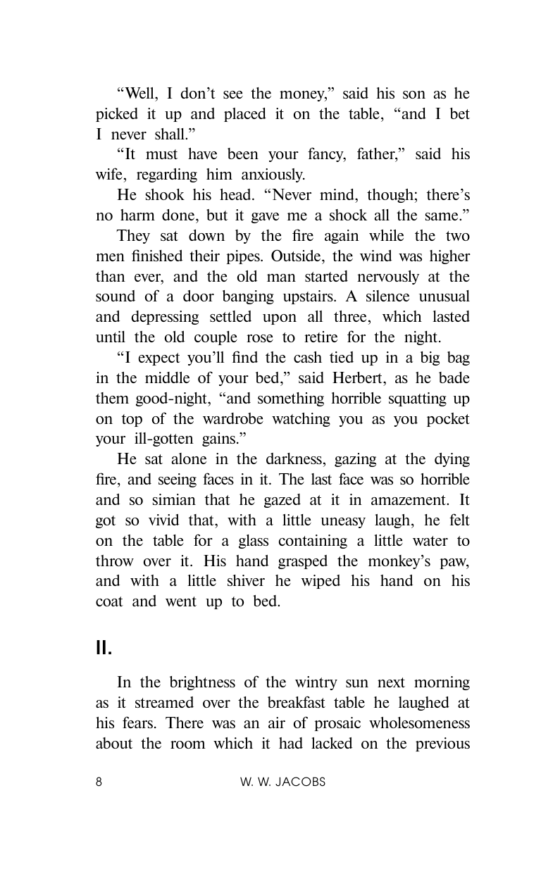 В этой книге собраны несколько рассказов Уильяма Уаймарка Джейкобса - признанного мастера коротких рассказов. Он обладал отличным чувством юмора и большой любовью к морю, что и определило тематику большинства его работ. Этот сборник, однако, содержит его работы с мистическими сюжетами, благодаря одному из которых он и стал широко известен. Небольшой рассказ "The Monkey's Paw" стал основой для множества экранизаций и вдохновил многих других писателей.