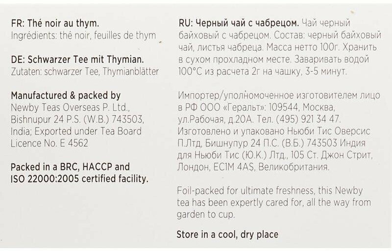 Чай Newby черный с чабрецом 100 г — великолепный черный чай с приятными травяными нотками чабреца. В основе замечательного дуэта высококачественное сырье, собранное с лучших мировых плантаций в самое благоприятное время чайного сезона. Неустанный контроль качества на всех этапах производства и составление смесей высококлассными специалистами позволяет получать достойные результаты и радовать многих поклонников чая ярким тонизирующим напитком.Чашка ароматного Newby Thyme станет приятным наслаждением для истинных гурманов. Ярко-янтарный настой черного чая с утонченными нотками чабреца идеален для употребления в течение всего дня, он прекрасно взбодрит, зарядит энергией и повысит концентрацию внимания. Чай с чабрецом прекрасен для угощения гостей и важных партнеров, клиентов и друзей.Состав: чай черный, чабрец.Способ приготовления: заварить в заварочном чайнике кипяченой водой и настоять 2-3 минуты.Вес: 100 г.Тип упаковки: картонная коробка.Условия хранения: хранить в чистом, хорошо вентилируемом помещении без посторонних запахов при относительной влажности воздуха не более 70%.Страна производства: Индия.
