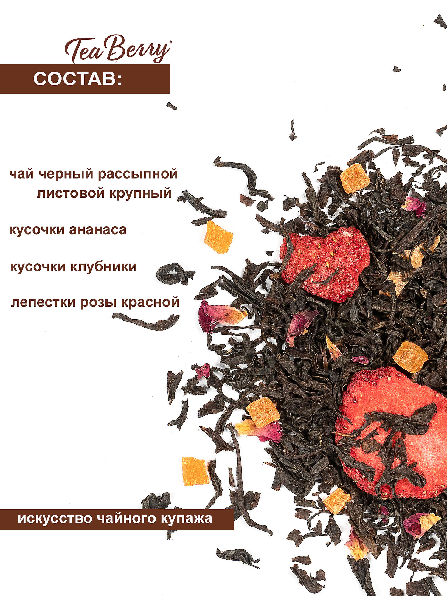 | Состав | Чай чёрный рассыпной листовой крупный, кусочки ананаса (ананас, сахар, регулятор кислотности: лимонная кислота), ароматизаторы, кусочки клубники, лепестки розы красной |