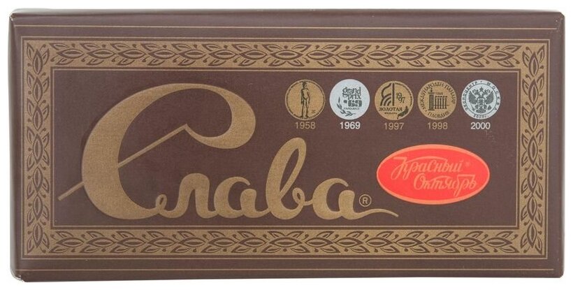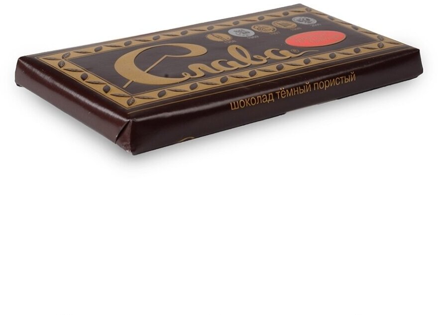 Темный пористый шоколад «Красный Октябрь» «Слава» имеет яркую подарочную бумажную обертку. На упаковке изображен логотип производителя с тремя видами золотых и двумя медалями из серебра. Также там есть золотистый ободок, на котором изображены листочки. Плитка темного шоколада имеет классический горьковатый вкус. В состав изделия входят: сахар, перетертые бобы какао, масло, соевый лецитин и ароматизатор «Ваниль». Не содержит ГМО, красителей и консервантов. Вес продукта составляет 75 г. Могут быть следы орехов и молочных продуктов. Шоколад без начинки, имеет немного рассыпчатую текстуру из-за большого количества пузырьков. Изделие имеет такую пищевую ценность на 100 грамм: