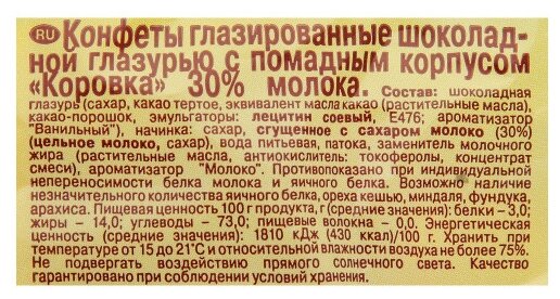 | Состав | Шоколадная глазурь (сахар, какао тертое, эквивалент масла какао (рафинированные, дезодорированные, фракционированные, негидрогенизированные растительные масла (пальмовое и ши)), какао порошок, эмульгаторы лецитин соевый, Е476, ароматизатор "ванильный"), начинка сахар, сгущенное с сахаром молоко (30%) (цельное млоко, сахар), вода питьевая, патока, заменитель молочного жира (рафинированные, дезодорированные, переэтерифицированные, частично гидрогенизированные и фракционированные растительные масла (пальмовое, подсолнечное, пальмоядровое), антиокислитель: токоферолы, концентрат смеси), ароматизатор Молоко |
