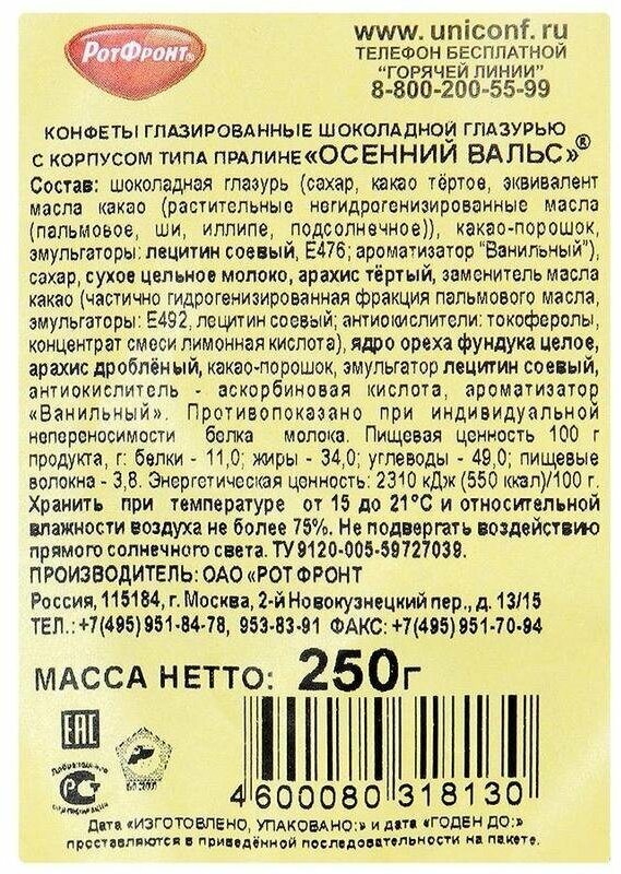 Сервис сравнения цен СкидкаГИД предлагает сравнить цены на товар «Конфеты Рот Фронт Осенний вальс с начинкой пралине 250 г флоу-пак»