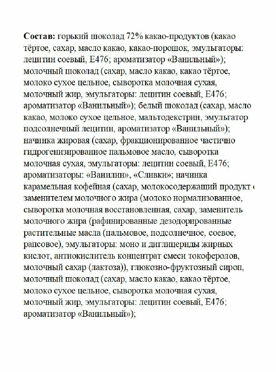 | Состав | Горький шоколад 72% какао-продуктов, молочный шоколад, белый шоколад, какао тёртое, масло какао, сахар, какао-порошок, молоко сухое, лецитин, ароматизатор ванили, перец кайенский, корица молотая, гибискуса порошок, абрикос сушеный, малина сублимированная, ароматизатор абрикос, фундук, соль, может содержать следы арахиса и орехов |