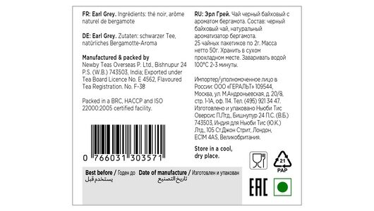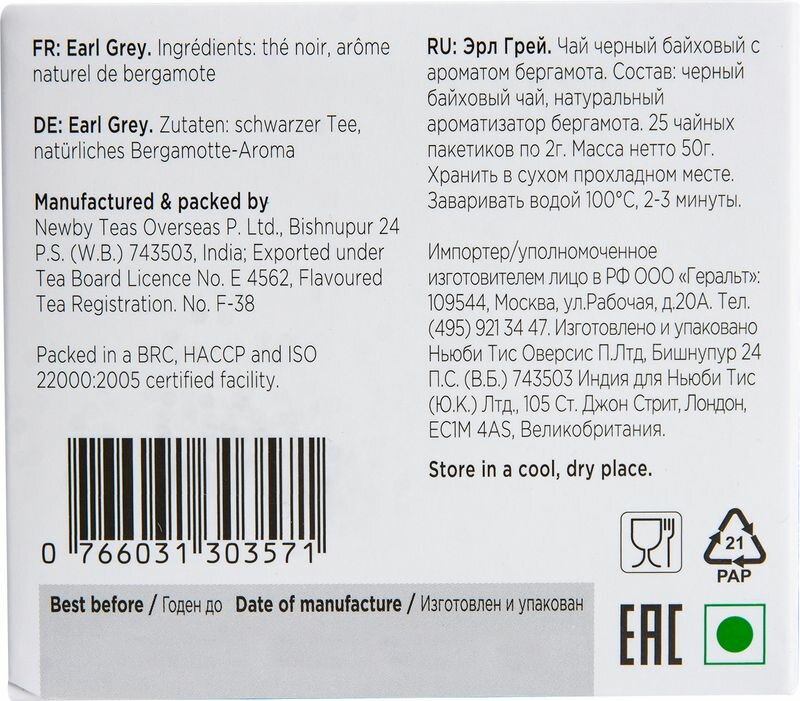 | Состав | черный байховый чай, натуральный ароматизатор бергамота. |