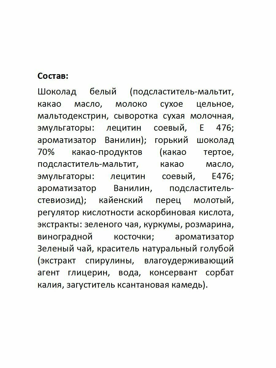 | Состав | Шоколад белый (сахар, масло какао, молоко сухое цельное, эмульгатор лецитин соевый, ароматизатор «Ванильный») молочный шоколад (сахар, масло какао, какао тёртое, сухое цельное молоко, сыворотка сухая молочная, молочный жир, эмульгаторы: лецитин соевый, Е476, ароматизатор «Ванильный») кусочки карамели (сахар, патока крахмальная (кукурузная), заменитель молочного жира (рафинированные дезодорированные растительные масла (пальмовое и его фракции, подсолнечное)), сухая молочная сыворотка, молоко сухое обезжиренное, эмульгатор лецитин соевый, соль) ароматизатор «Жженый сахар». |