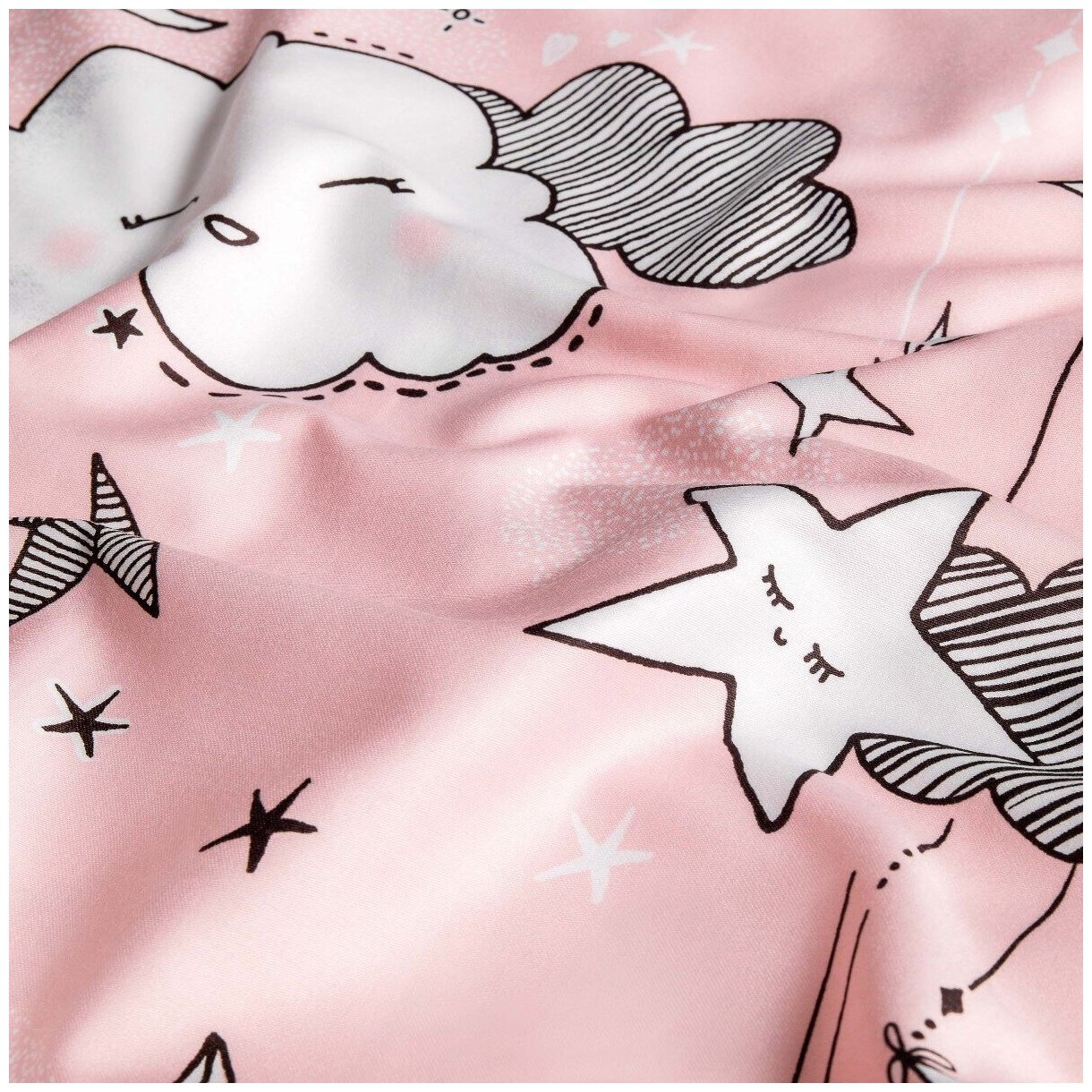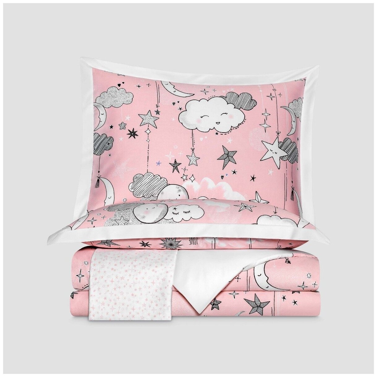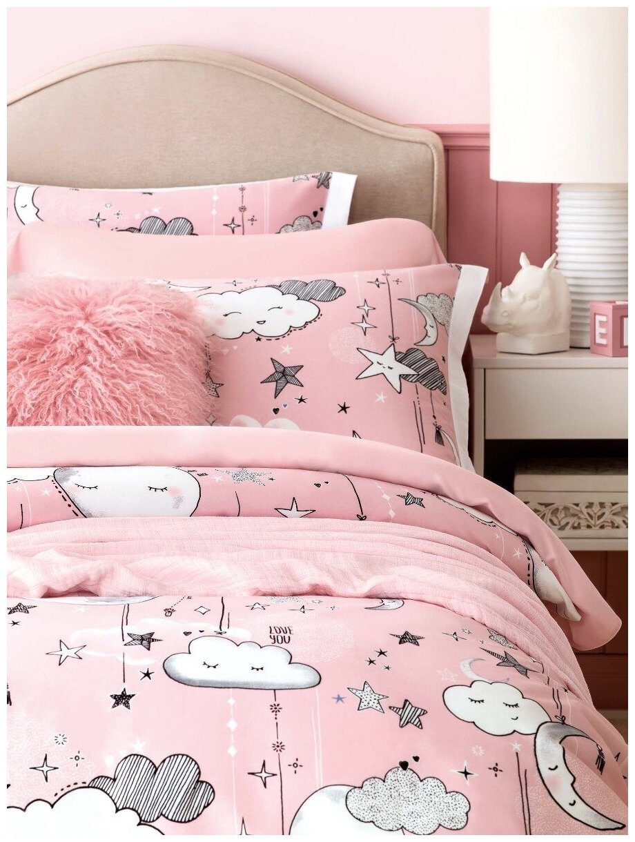 Мягкость белья дополнена нежно-розовой палитрой, предназначенной специально для маленьких принцесс. Принт комплекта, звезды и облака, выполнен в манере детского рисунка карандашом. Он располагает ко сну, наполненному удивительными сказками