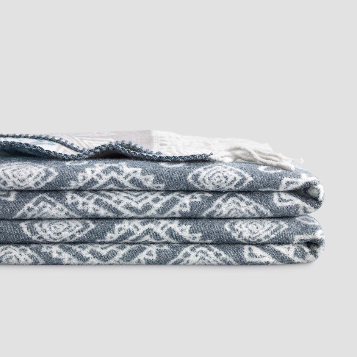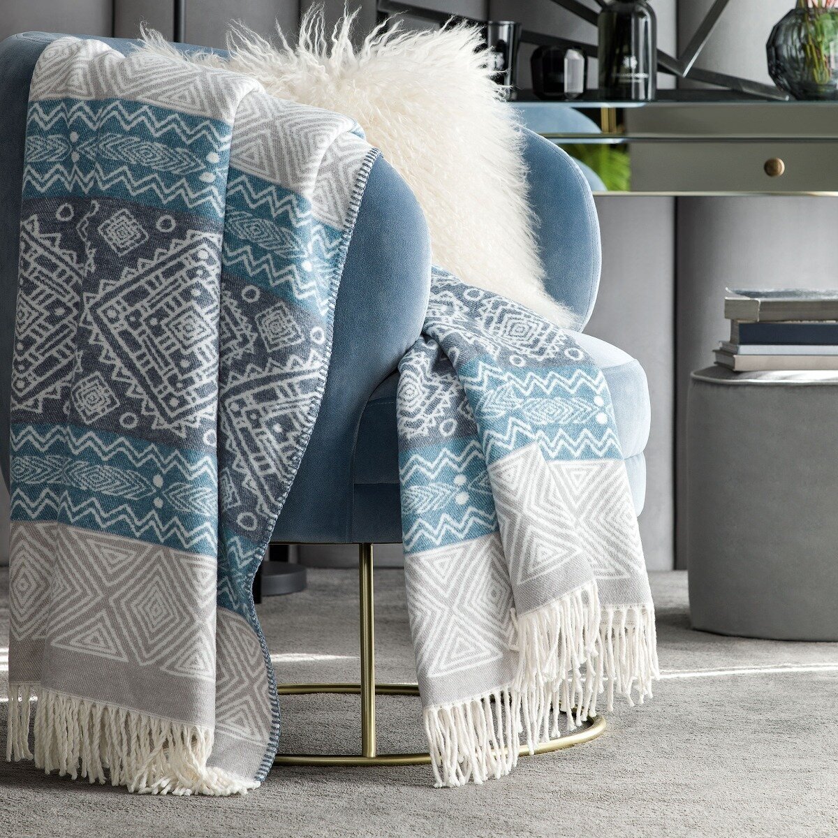 Мягкий плед «Ансальди» изготовлен из натуральных волокон – в нем экологичный хлопок сочетается с шелковистым, нежным на ощупь модалом. Эти волокна хорошо попускают воздух, такой плед, наброшенный на плечи, позволяет телу дышать, под ним не жарко, вместе с тем он уютный и теплый. Модал в составе изделия делает его более шелковистым и нежным, мягкая велюровая поверхность пледа приятна на ощупь. Модель привлекает внимание необычными этническими мотивами орнамента. Пледа декорирован белоснежной бахромой, с двух сторон края «Ансальди» вручную обшиты контрастными нитями. Холодная серо-голубая зимняя гамма оттенков, оригинальный этнический орнамент и мягкая велюровая поверхность изделия превращают «Ансальди» в прекрасный новогодний подарок.