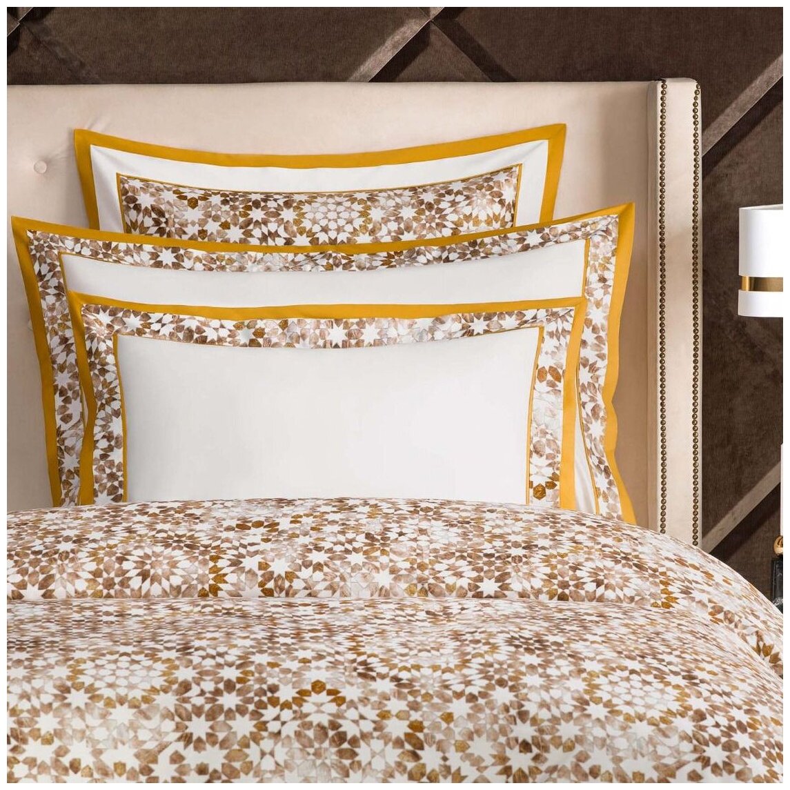 Яркие наволочки «Нурим» созданы из шелковистого хлопка-сатина повышенной плотности. Ткань с сатиновым плетением нитей гладкая, мягкая и нежная на ощупь, обладает легким блеском. Белье из хлопка-сатина не деформируется и не дает усадки, его краски не поблекнут после многочисленных стирок. Постельное белье прошло двойную мерсеризацию, специальную обработку для придания ему еще большей мягкости. Для этого комплекта использованы лучшие сорта длинноволокнистого хлопка. Из длинных хлопковых волокон получается прочный материал, который хорошо впитывает влагу. Сложные переплетения линий орнамента на ткани «Нурим» и его теплые золотистые оттенки напоминают стилизованный восточный узор гирих. Он выражает совершенство геометрической красоты и является символом божественного начала. Теплая палитра – это цвета горячего песка и жаркого солнца. Наволочки с обратной стороны однотонные – яркого солнечно-горчичного цвета. Наволочки украшены двойным декоративным бордюрам. Данное изделие выглядит нарядно и эффектно, в нем нашла отражение восточная яркость красок, символизм и философский смысл исламских орнаментов. Уход — деликатная стирка при температуре 40°С с применением моющих средств для цветного белья — перед первым использованием рекомендуется постирать — не отбеливать — допускается барабанная сушка (деликатный режим)