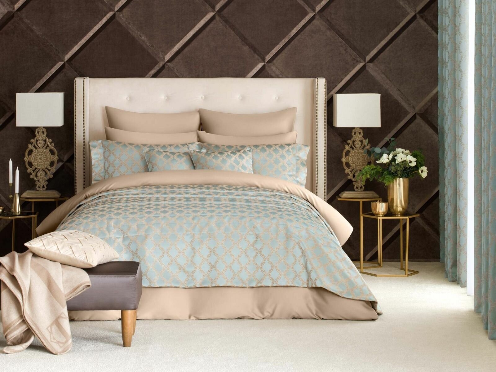 «Борха» – это классический дизайн в итальянском стиле. На нежно-голубом, оттенка голубого аквамарина, фоне выделяется знаменитый орнамент – «венецианская решетка». Этот узор вышит золотыми нитями и при ближайшем рассмотрении состоит из тонких переплетающихся веточек с листьями. Материал покрывала напоминает роскошные, расшитые золотом итальянские ткани эпохи Ренессанса. В комплекте с покрывалом представлены две квадратные декоративные подушки и две наволочки.