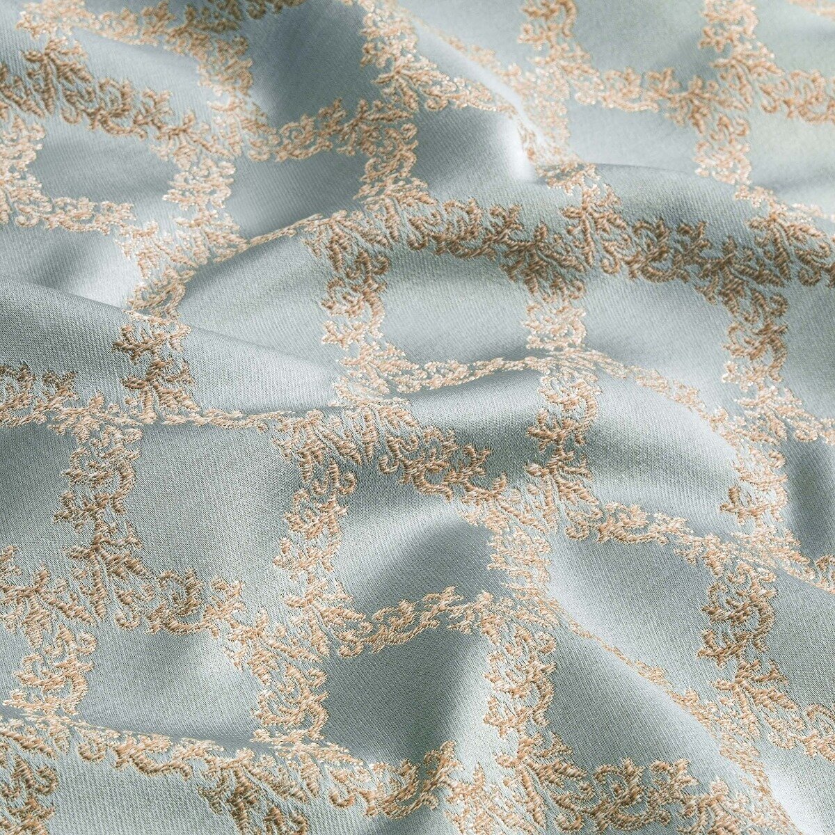 «» – это классический дизайн в итальянском стиле. На нежно-голубом, оттенка голубого аквамарина, фоне выделяется знаменитый орнамент – «венецианская решетка». Этот узор вышит золотыми нитями и при ближайшем рассмотрении состоит из тонких переплетающихся веточек с листьями. Шторы «» напоминают роскошные, расшитые золотом итальянские ткани эпохи Ренессанса. В комплекте со шторами представлено покрывало с двумя декоративными подушкам и двумя наволочками.