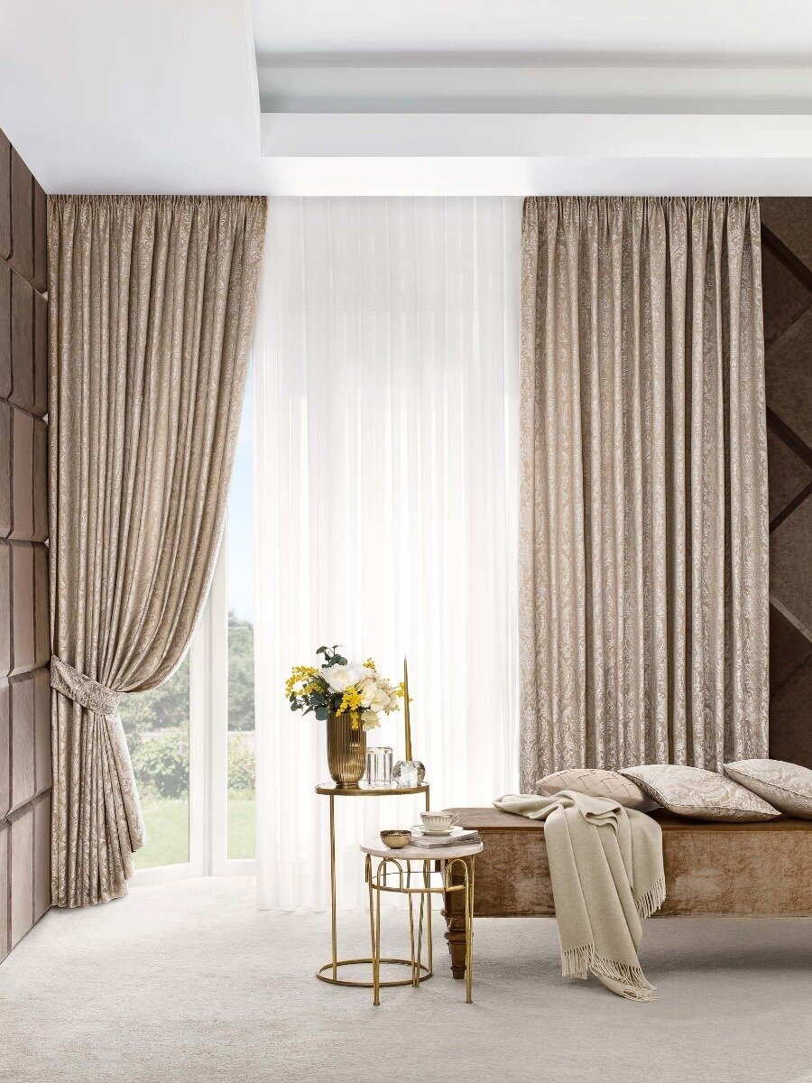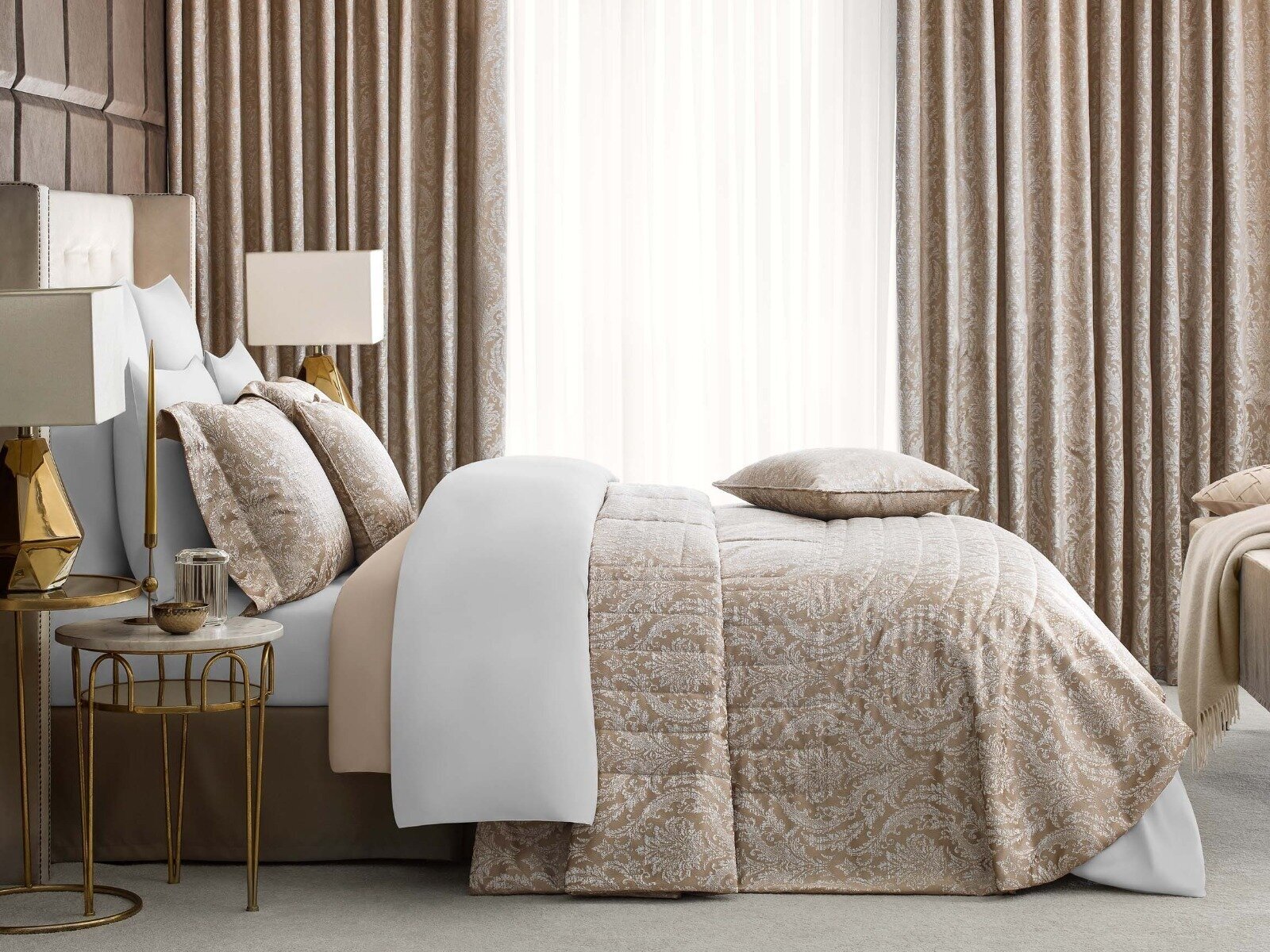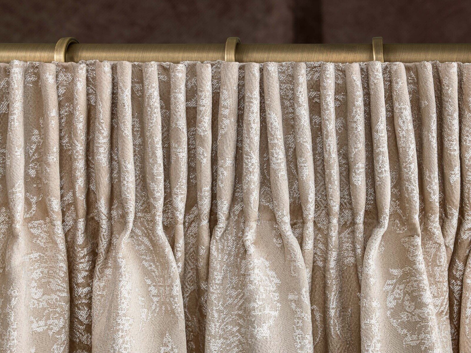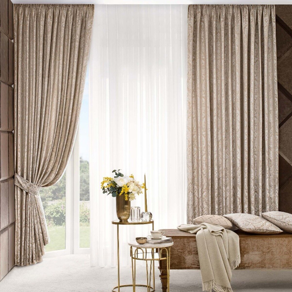 Ткань, из которой изготовлены шторы «», – высококачественный износостойкий полиэстер. Текстиль из полиэстера не деформируется, пластичен, прекрасно драпируется мягкими складками. Это одна из лучших тканей для штор, которая не выгорает на солнце. Материал прост в уходе – изделия быстро сохнут и не дают усадки при стирке. Шторы «» сочетают красоту жаккардового плетения с практичностью и долгим сроком службы. Эти роскошные шторы словно пришли к нам из спальни одного из замков эпохи Ренессанса. Золотистая ткань украшена классическим орнаментом дамаск жемчужного цвета. Узор имеет выраженный рельеф и красиво выделяется на поверхности штор благодаря использованию сложной 3d техники жаккардового плетения нитей. Эта модель была создана для спален, оформленных в классическом стиле. Шторы можно дополнить покрывалом «».