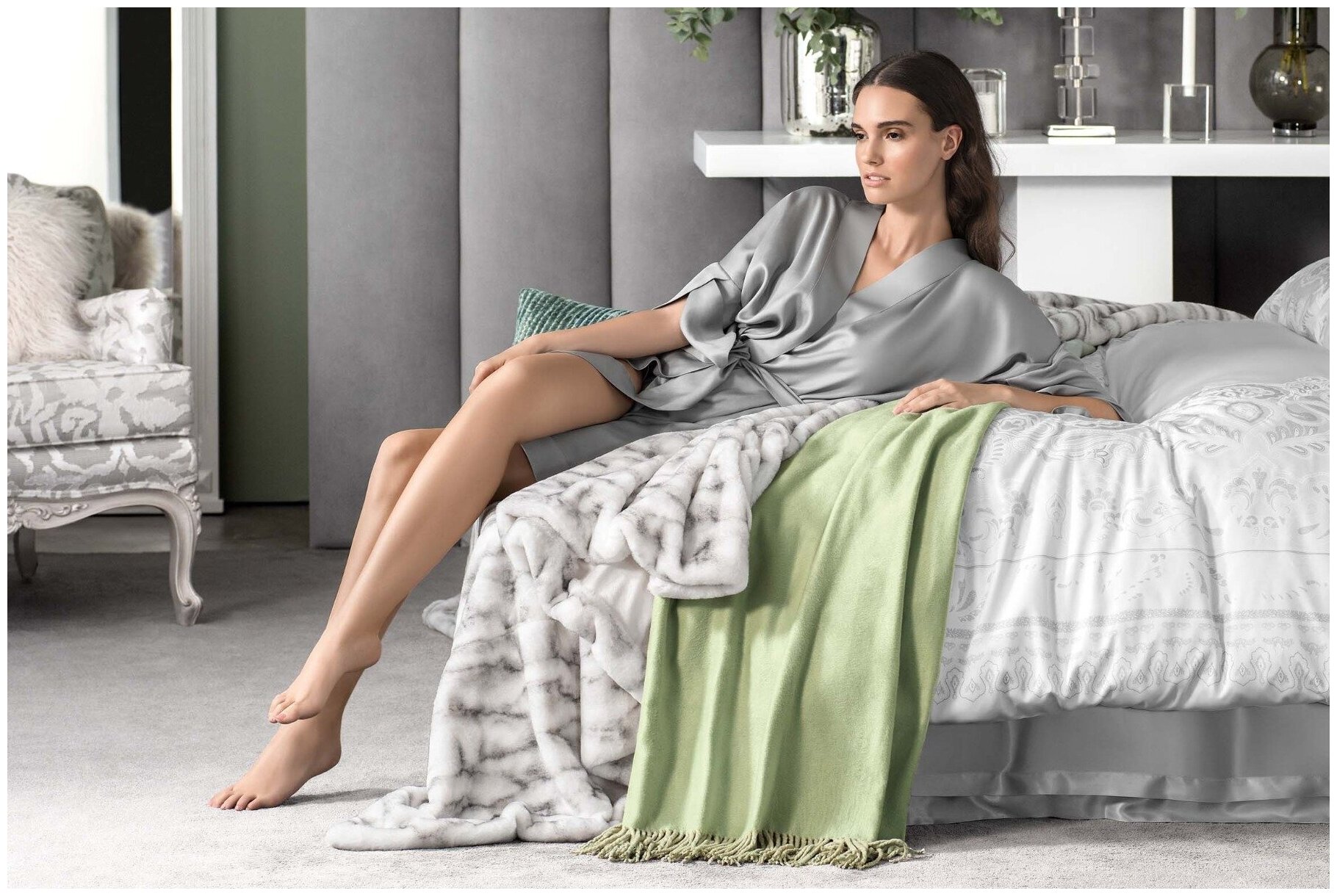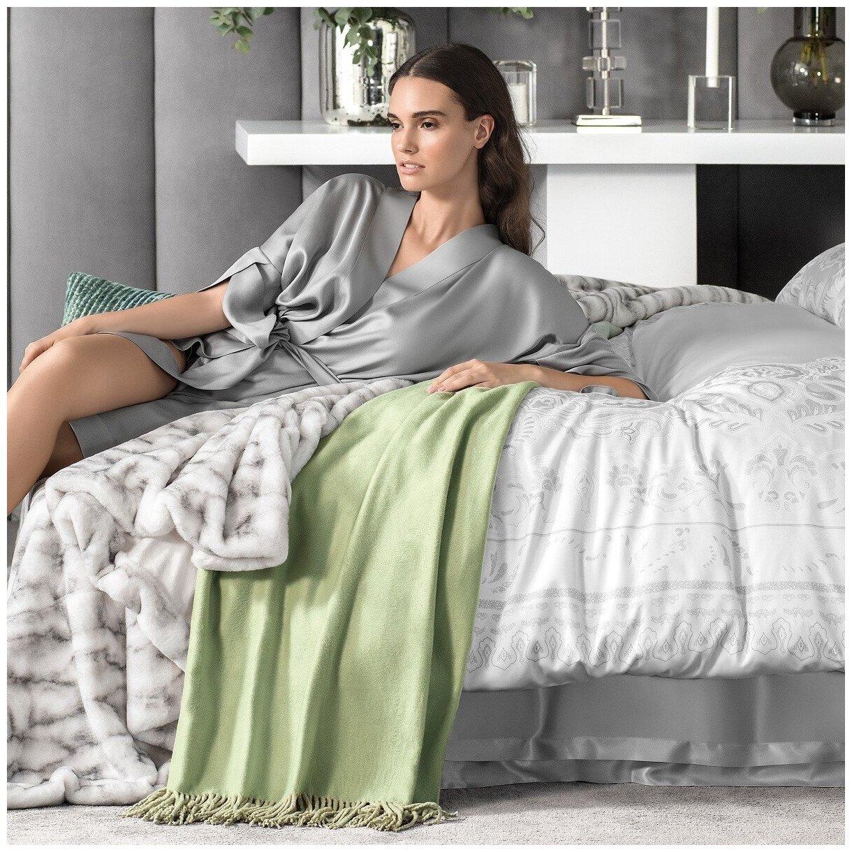В красивом и приятном на ощупь двустороннем пледе «Маринетти» нежный сияющий шелк высшего сорта сочетается с экологичным хлопком. Натуральный шелк обладает уникальными природными свойствами: несмотря на легкость и деликатность нитей, это необыкновенно прочный материал с отличной воздухопроницаемостью. Нежная гипоаллергенная шелковая ткань пледа идеальна для людей с чувствительной кожей. Эта легкая модель выполнена в летней палитре: нежная зелень, дополненная с другой стороны оттенком экрю. Эти тона создают красивый, изысканный контраст. Роскошный шелковый плед «Маринетти» станет прекрасным праздничным подарком.