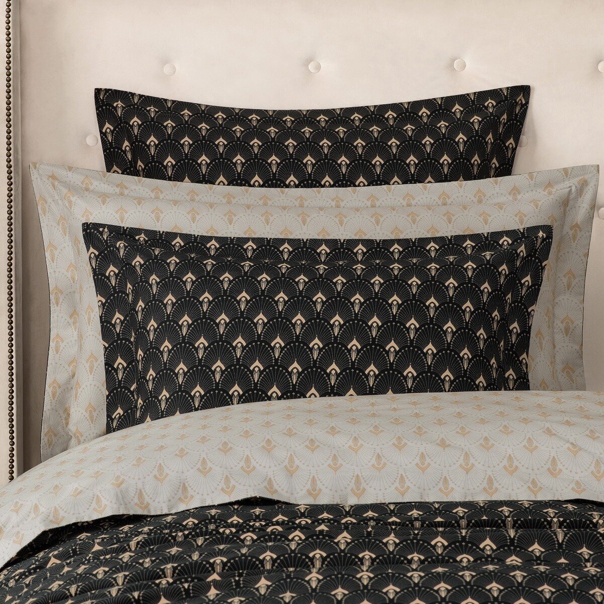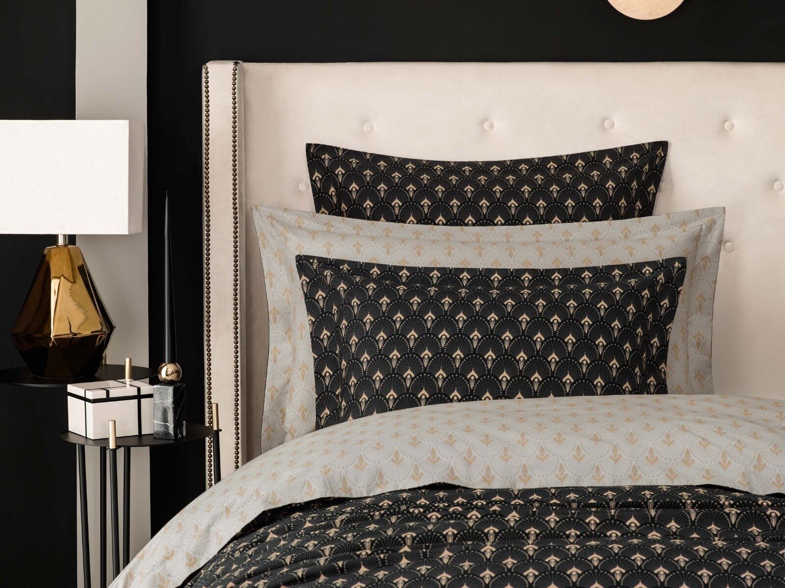 Наволочки «Ладнер» изготовлены из Роял сатина, мягкой, деликатной ткани с сатиновым плетением нитей.Особенную мягкость, а также прочность этой материи придает использование самого лучшего сырья – тонких нитей длинноволокнистого хлопка. После специальной обработки лицевой стороны ткани Роял сатин приобретает легкую бархатистость, что идеально подойдет людям с чувствительной кожей, для которых особенно важна нежность прикосновения. Белье долго прослужит, за ним несложно ухаживать. Если разложить «Ладнер» на плоской поверхности, гладить наволочки почти не придется.Строгий и стильный золотой орнамент на черной ткани – отсылка к роскошной эпохе ар-деко с ее геометрией линий и форм. Характерные цвета этого стиля – золотой, черный, серебристый и составляют три цвета комплекта, эффектно контрастируя между собой. Орнамент «Ладнер» – стилизованное изображение египетской пальметты, олицетворяющей лучи восходящего солнца, одно из самых популярных изображений ар-деко. Наволочки двусторонние, на обратной стороне повторяется тот же рисунок, но уже на серебристо-сером фоне ткани.