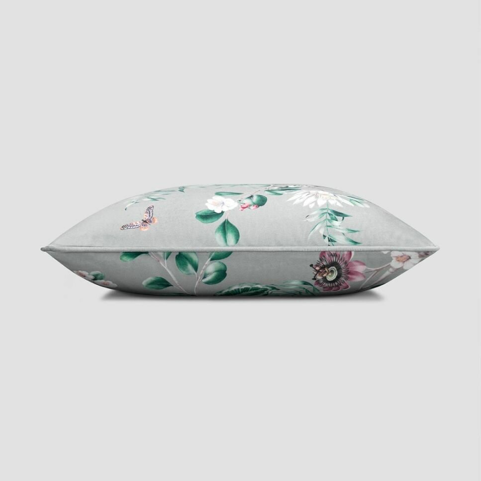 Эффектная декоративная подушка «Альфабия» изготовлена из нежного сияющего бархата.В основе ткани наволочки высококачественное полиэфирное волокно. Этот материал практичен и долго прослужит. Наволочка не выгорит на солнце, яркие краски рисунка не потеряют яркости спустя долгое время. Текстиль из бархата с красивым блестящим ворсом на лицевой стороне роскошно выглядит, его часто используют в интерьерном декоре.Внутри подушки – искусственный лебяжий пух, высококачественное микроволокно, мягкое, нежное и одновременно упругое. Наполнитель эластичен и быстро восстанавливает свою форму после сжатия, поэтому подушка не деформируется и сохранит свой нарядный вид.Эта декоративная подушка входит в коллекцию «Альфабия», наполненную красотой и зноем тропического сада, ярким оперением птиц и необыкновенными цветами. Ее украшает яркий принт, душистые цветы, яркие птицы и тропические бабочки выделяются на светло-сером фоне бархатной ткани. Сочетание пепельно-серого цвета фона и оттенка сочной изумрудной зелени рисунка – одно из самых гармоничных и при этом эффектных. Несколько таких подушек в гостиной превратят ее в уголок знаменитого тропического сада Альфабия, одной из жемчужин острова Майорка.