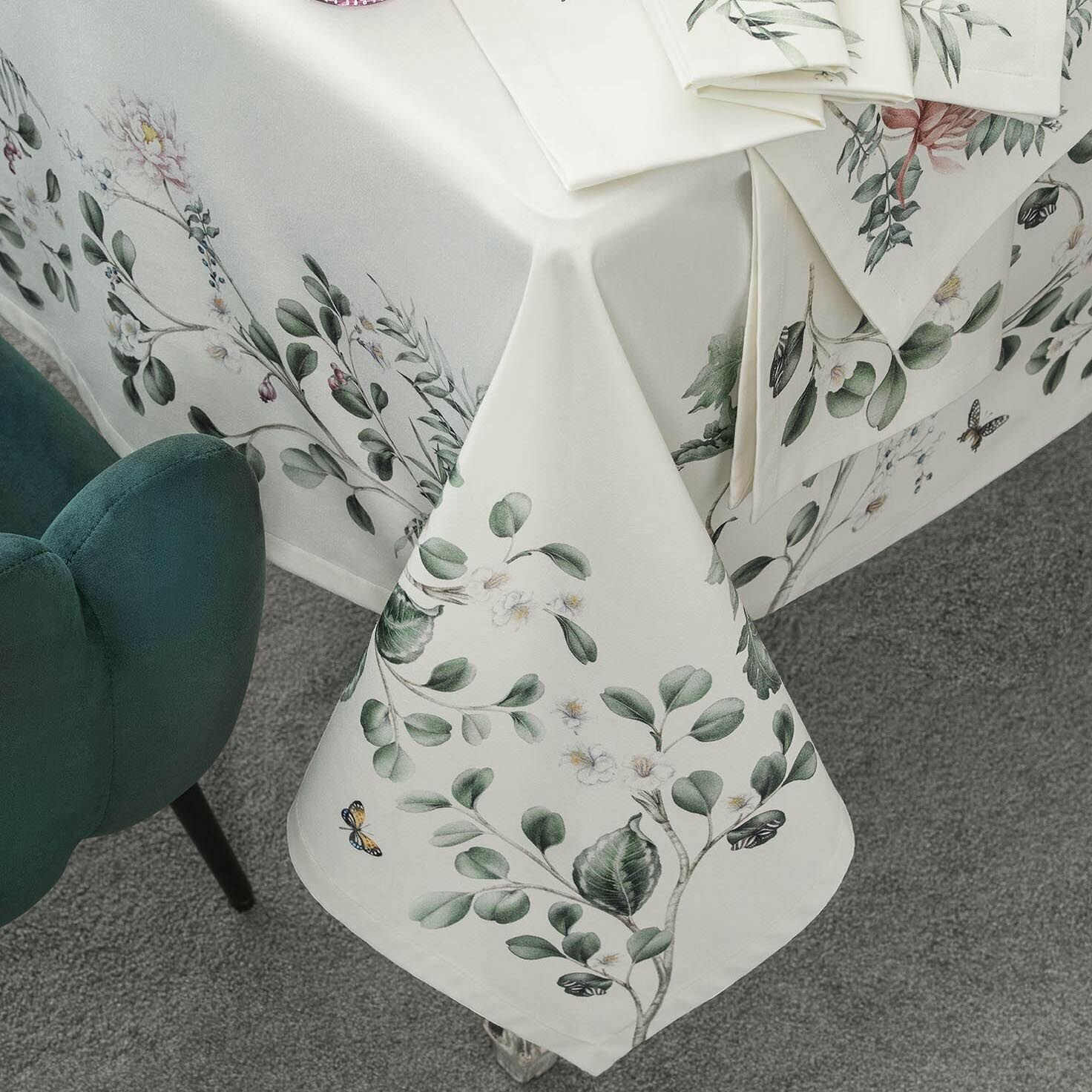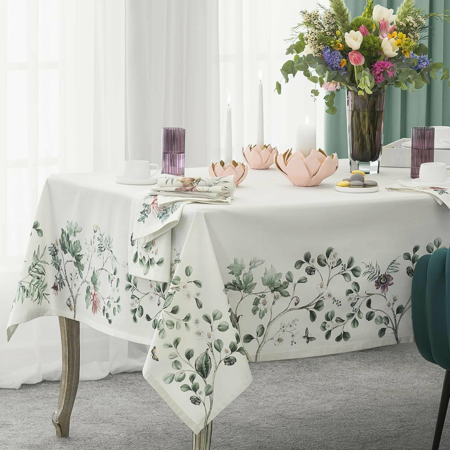 Скатерть «Альфабия» изготовлена из плотной ткани с водоотталкивающей пропиткой.Материал этой модели – 100% хлопок высокого качества. Хлопковый текстиль экологичен и гигиеничен, скатерти прочны, не электризуются. Изделия из хлопковой ткани можно стирать в домашних условиях, они быстро сохнут. Специальное водоотталкивающее покрытие скатерти убережет поверхность стола от пролитых жидкостей.Красивый флоральный дизайн «Альфабии» напоминает ботанические иллюстрации, в которых тонко выписанные лепестки и прожилки на листьях кажутся объемными, живыми. Цветочный орнамент обрамляет однотонную скатерть сливочного оттенка по периметру. Эту нарядную летнюю модель можно сочетать с салфетками из коллекции «Альфабия». Каждая салфетка – это новый цветок с изящными лепестками и разные виды бабочек. Выбирайте комбинации, которые вам нравятся, и создавайте собственный летний дизайн интерьера столовой.