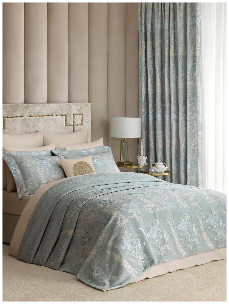 Комбинированная ткань покрывала «Арсе» – практичный полиэстер с добавлением шелковистой, мягкой вискозы.Текстиль из полиэфирных волокон износостойкий и практичный, не выгорает на солнце, не дает усадки при стирке. Шенилловые нити в составе ткани делают «Арсе» более мягким, слегка бархатистым на ощупь.Это жаккардовое покрывало украшено эффектным флоральным орнаментом. Крупные садовые цветы, созданные в гобеленовой технике, имеют легкий рельеф и красиво выделяются на фоне ткани оттенка аквамарина. Выразительный рисунок, вытканный с помощью жаккардового плетения, подчеркивает мягкость шенилловых нитей в ткани «Арсе» и их нежный светло-аквамариновый оттенок.