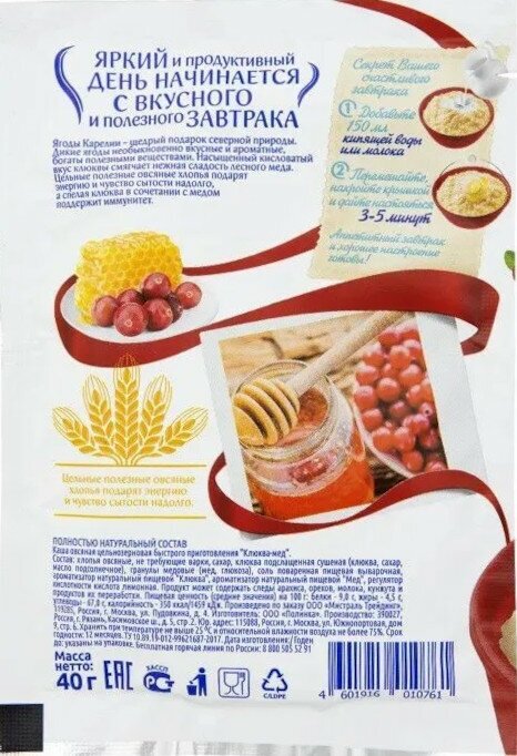 | Состав | Хлопья овсяные, не требующие варки, сахар, клюква подслащенная (клюква, сахар, масло подсолнечное), гранулы медовые (мед, глюкоза), соль поваренная пищевая выварочная, ароматизатор натуральный пищевой “Клюква”, ароматизатор натуральный пищевой “мед”, регулятор кислотности кислота лимонная. |