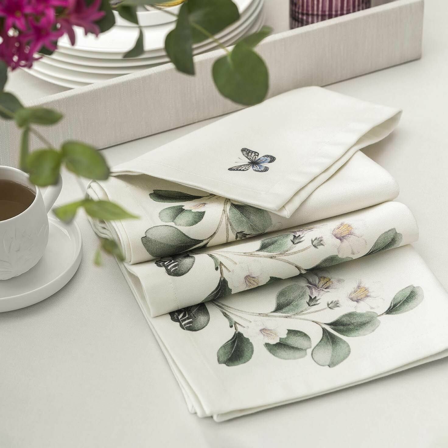 Квадратная салфетка «Альфабия» изготовлена из плотной хлопковой ткани.В ее основе лучшие сорта натурального хлопка. Хлопковый текстиль экологичен и гигиеничен, изделия прекрасно впитывают влагу и быстро высыхают. Плотная ткань не деформируется, салфетки хорошо сохраняют форму.Красивый флоральный дизайн «Альфабии» напоминает ботанические иллюстрации, в которых тонко выписанные лепестки и прожилки на листьях кажутся объемными, живыми. Нежные бело-лиловые цветы декорируют салфетку с одной стороны, с другой изображена маленькая бабочка, летящая навстречу цветочным лепесткам и нектару. В коллекции «Альфабия» есть три вида салфеток, каждая из них – это новый цветок и разные бабочки. Выбирайте комбинации, которые вам нравятся, и создавайте собственный летний дизайн интерьера столовой.