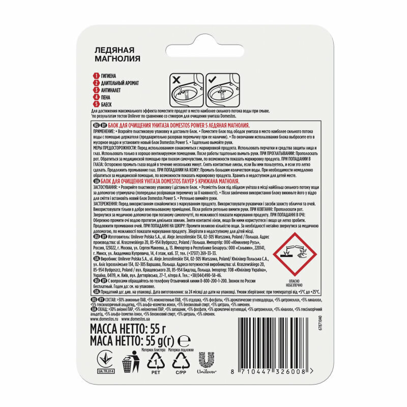 Туалетный блок Domestos Power 5 Ледяная магнолия, содержащий активный хлор, известный своими дезинфицирующими свойствами. Domestos Power 5 - это сила пяти компонентов: обильная пена, предотвращение известкового налета, длительный аромат, блеск, гигиена. Для достижения максимального эффекта поместите продукт в место наиболее сильного потока воды при смыве.