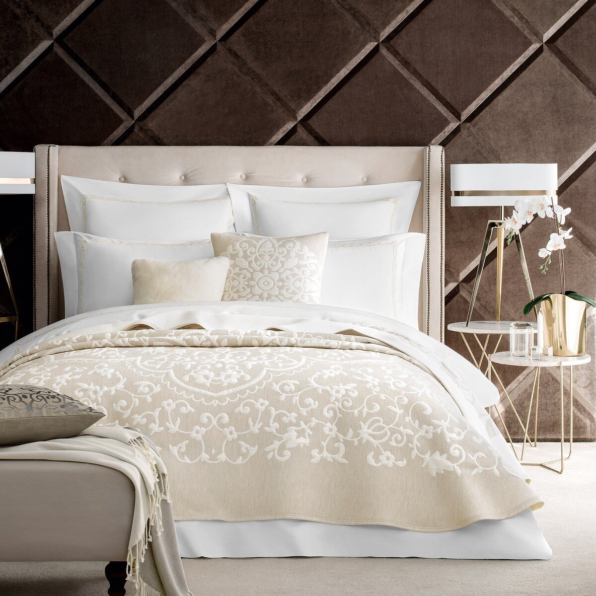 Пастельный бежевый фон покрывала «Монте» оформлен флоральным орнаментом в классическом стиле, выполненным при помощи сложного жаккардового плетения нитей. В ткани покрывала шелковистая, гладкая вискоза сочетается с практичным и прочным полиэстером. Благодаря такой комбинации волокон получилось мягкое, приятное на ощупь и одновременно износостойкое изделие. Жаккардовая ткань прочна, не деформируется и не сминается. «Монте» впечатляет своей рельефной фактурой. Орнамент на этом покрывале выполнен с эффектом 3D, он кажется объемным, выпуклым. Ткань оттенка кофе латте, дополненная белоснежным орнаментом – это наиболее комфортное, приятное для глаз сочетание цветов.