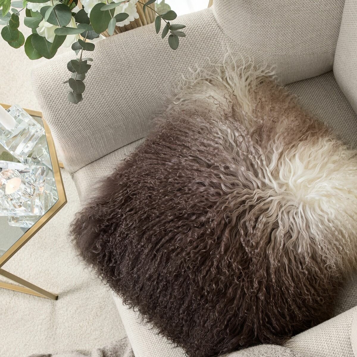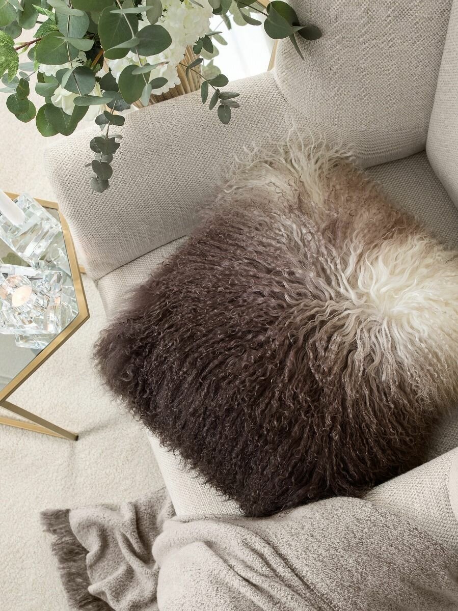 Декоративная подушка «Либерт» изготовлена из длинной, пушистой шерсти монгольских мериносов. Овцы мериносовой породы имеют мягкие и очень тонкие шерстинки, которые в несколько раз тоньше человеческого волоса. Изделия из шерсти и меха полезны для хорошего самочувствия, положительно влияют на нервную систему, к ним приятно прикоснуться. Подушки из пышного натурального меха эффектно смотрятся в любом помещении. Руно окрашено с применением эффекта деграде, что создает красивый переход оттенков кофейной палитры от насыщенного кофейного цвета до нежного оттенка взбитых сливок. Несколько таких эффектных пышных подушек украсят интерьер гостиной или спальни.
