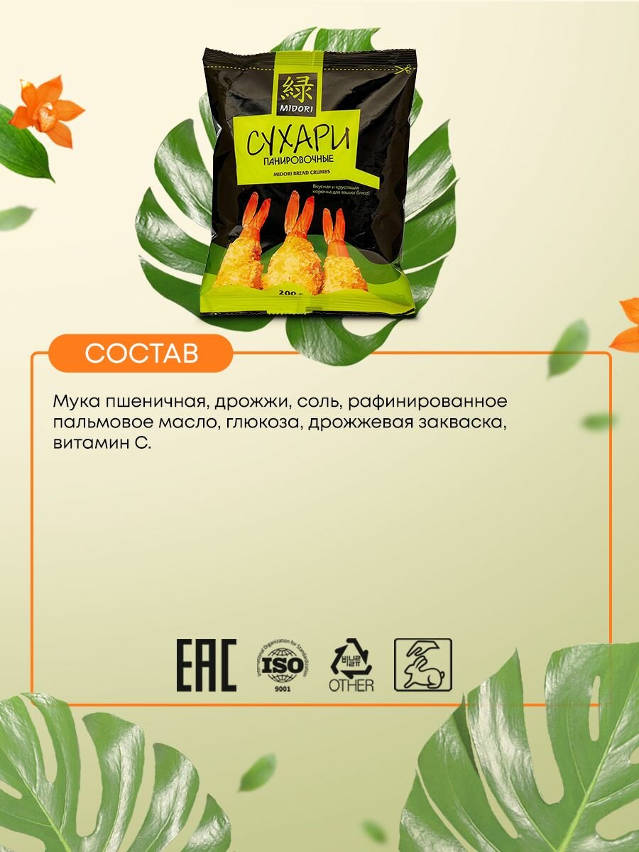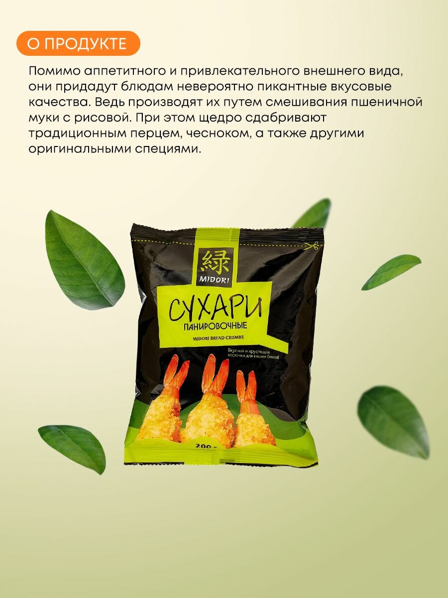Панировочные сухари " Мидори" производятся только из свежего хлеба, поэтому в процессе жарки на продуктах образуется равномерная хрустящая корочка, которая придаст Вашим блюдам привлекательный внешний вид и максимально сохранит сочность продуктов. Панировочные сухари " Мидори" подходят для жарки мяса, птицы, рыбы и других продуктов. Готовьте вкусные блюда для вашей семьи с панировочными сухарями " Мидори".