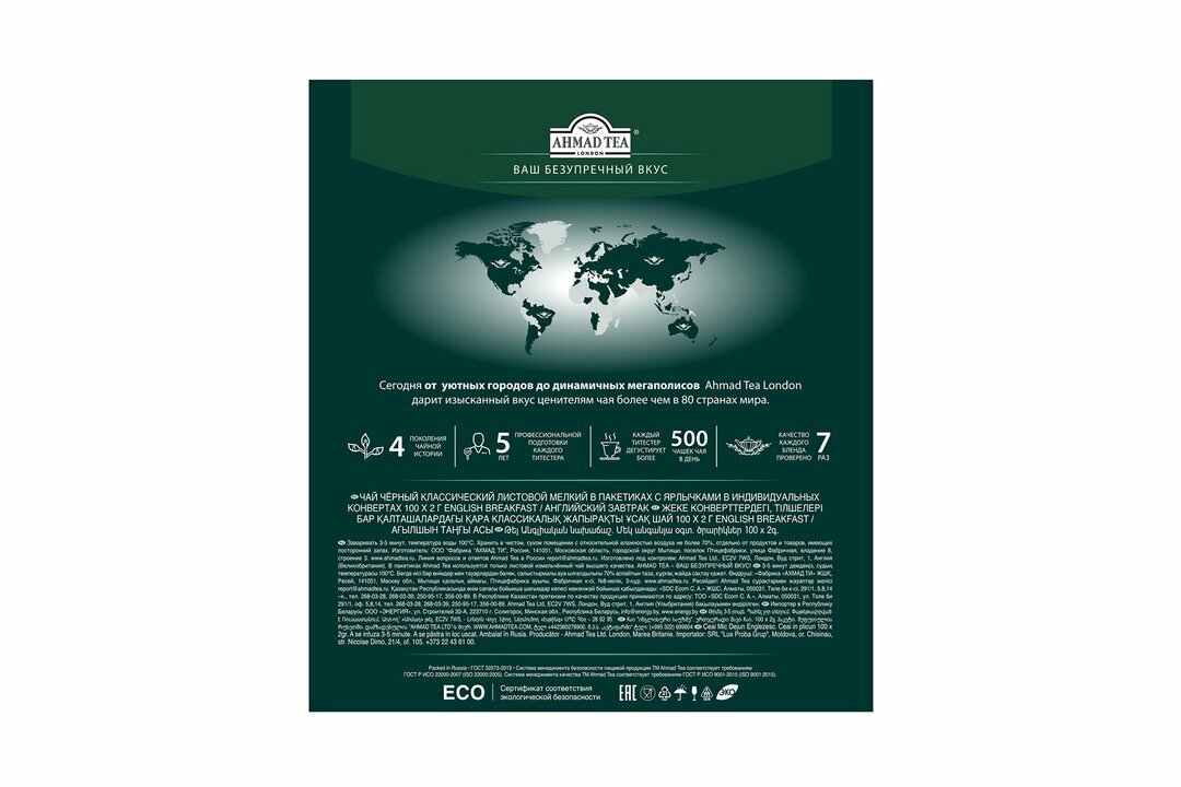 Два континента и три страны соединились в этом чае. Золотые искры Ассамского, объемный насыщенный вкус Кенийского и крепость Цейлонского чая нашли в нем гармоничное единство и прекрасный баланс. Аромат его свежий и пряный, вызывает воспоминания об ароматах летнего сада. Он украсит чаепитие в любое время, но традиционно считается чаем для завтрака, так как бодрит, освежает и прекрасно сочетается с молоком. В пакетиках Ahmad Tea используется только листовой измельченный чай высшего качества. Исключительную свежесть чая гарантирует конверт из специальной фольги. Истинный ценитель чая знает, что в основе разнообразия вкусов от Ahmad Tea всегда лежит безупречное качество чая. Благодаря уникальной системе контроля качества, английская компания Ahmad Tea Ltd.