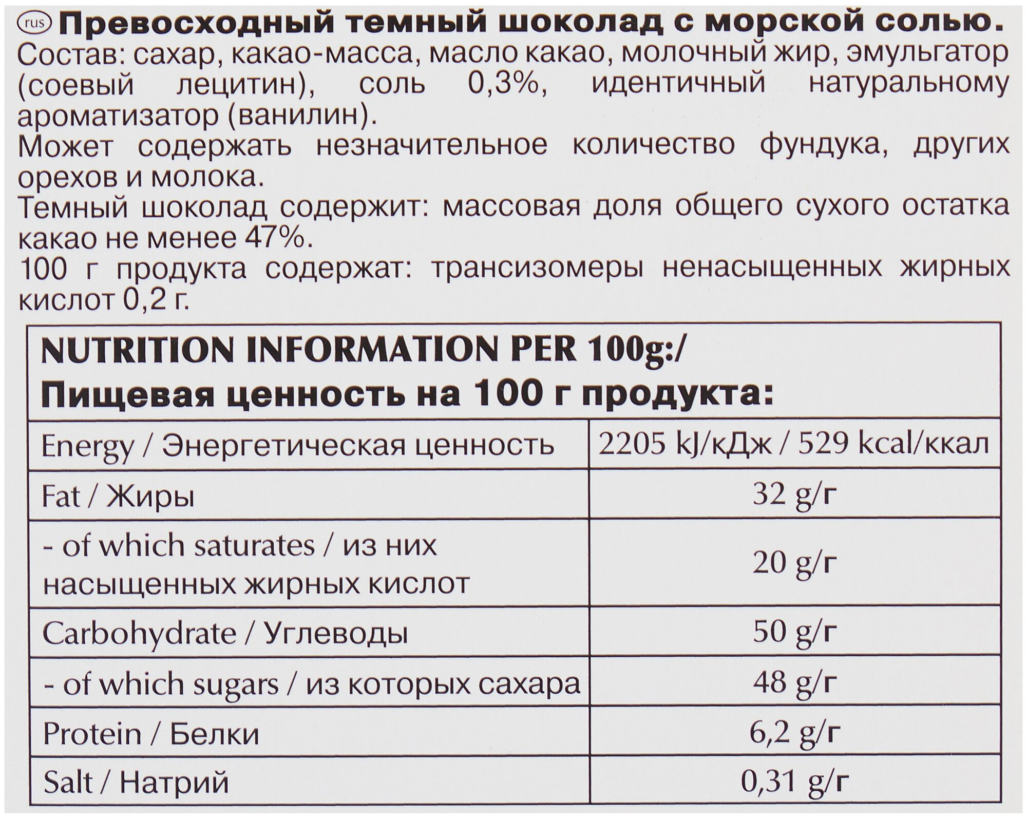| Состав | сахар, какао-масса, масло какао, молочный жир, эмульгатор (соевый лецитин), соль 0,3%, идентичный натуральному ароматизатор (ванилин). может содержать незначительное количество фундука, других орехов и молока. |