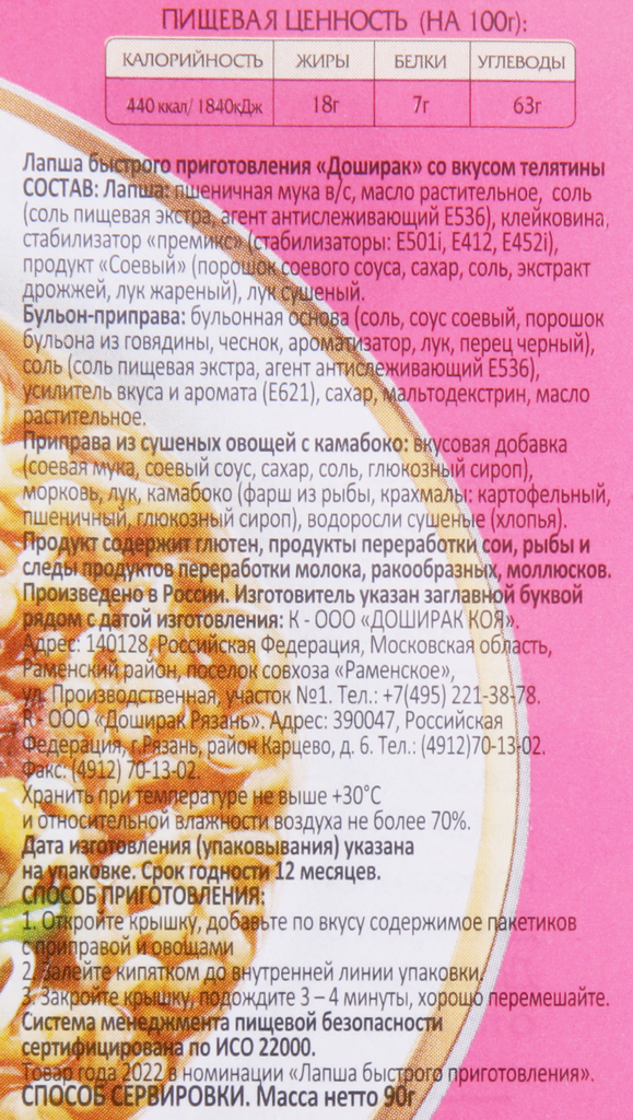 | Состав | Пшеничная мука в/с, растительное масло, модифицированный картофельный крахмал, соль, пищевая добавка эмульгатор "К-300А" (соевое масло, эмульгатор лецитин), клейковина, комплексная пищевая добавка стабилизатор "Премикс" (стабилизатор карбонат калия, стабилизатор гуаровая камедь, стабилизатор полифосфат натрия), приправы смешанные (сахар, экстракт дрожжей, растительный протеин, лук, порошок соевого соуса), сушеная ламинария (порошок), лук сушеный. Бульон-приправа: бульонная основа (порошок бульона из говядины, соус соевый, чеснок, ароматизатор "телятина", лук, перец черный), соль, усилители вкуса (глутамат натрия), сахар, мальтодекстрин. Приправа из сушеных овощей: соевый текстурат, морковь, лук, водоросли сушеные (хлопья). |