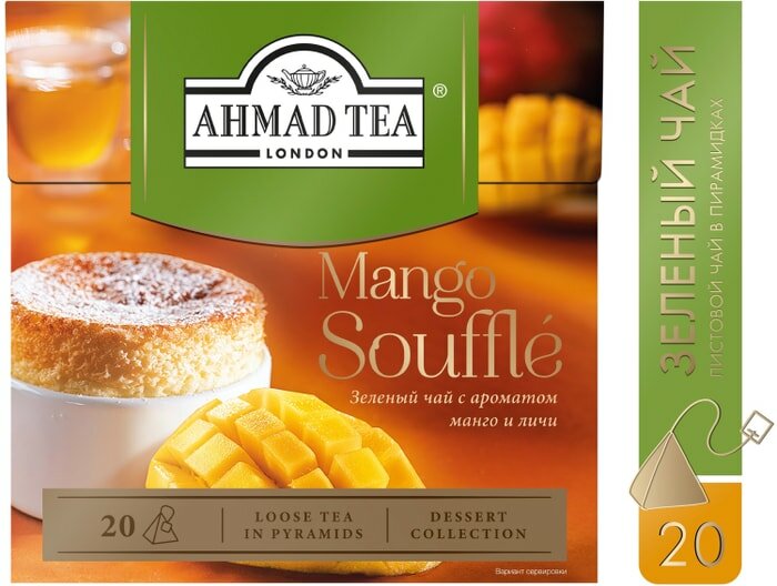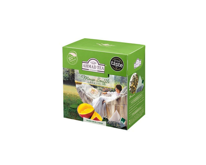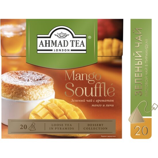 Манговое Суфле от Ahmad Tea - сбалансированный букет вкусов, в котором нашли гармоничное сочетание цитрусовая сладость личи, кусочки экзотического манго и терпкая нотка китайского зеленого чая. Каждый глоток подарит наслаждение вкусом изысканного воздушного десерта с хрупкой карамельной корочкой с нежной фруктовой начинкой.